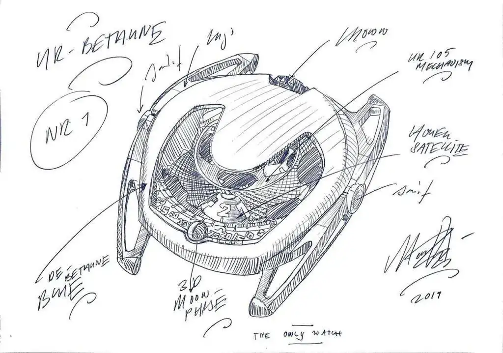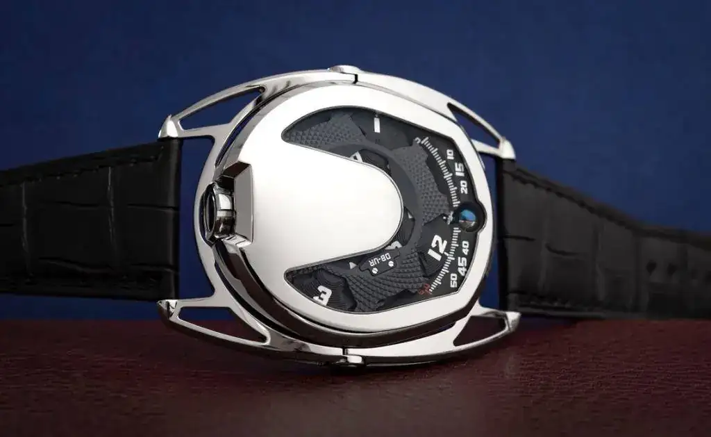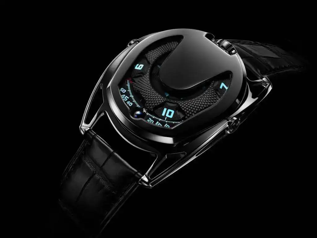 - Indicación satelital de la hora diseñada por Urwerk, con triple pletina en ARCAP. Satélite hecho de aluminio, montado sobre bronce de berilio. Índices pintados a mano con SuperLuminova.