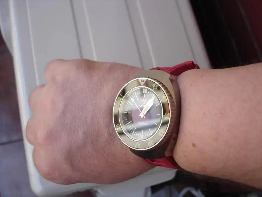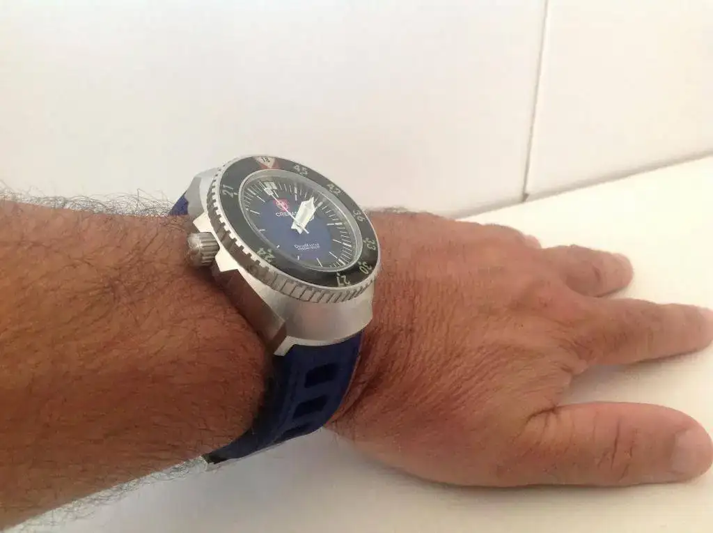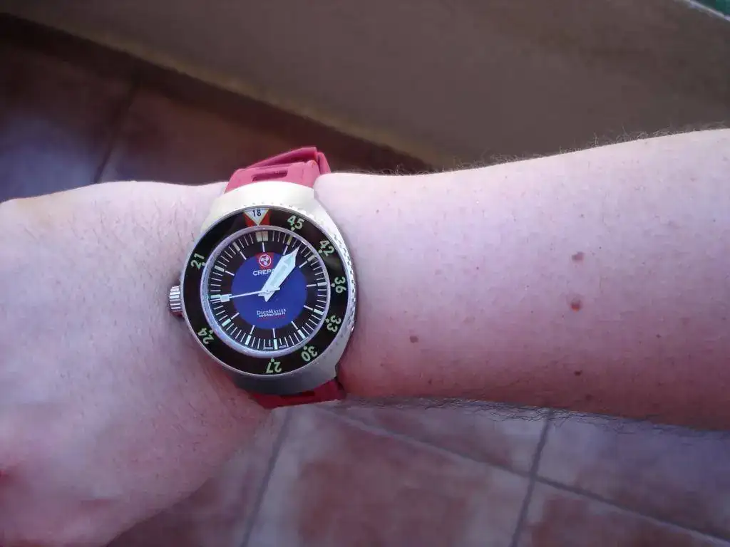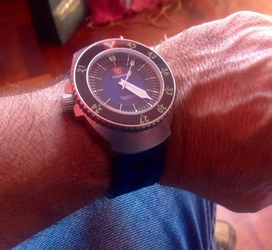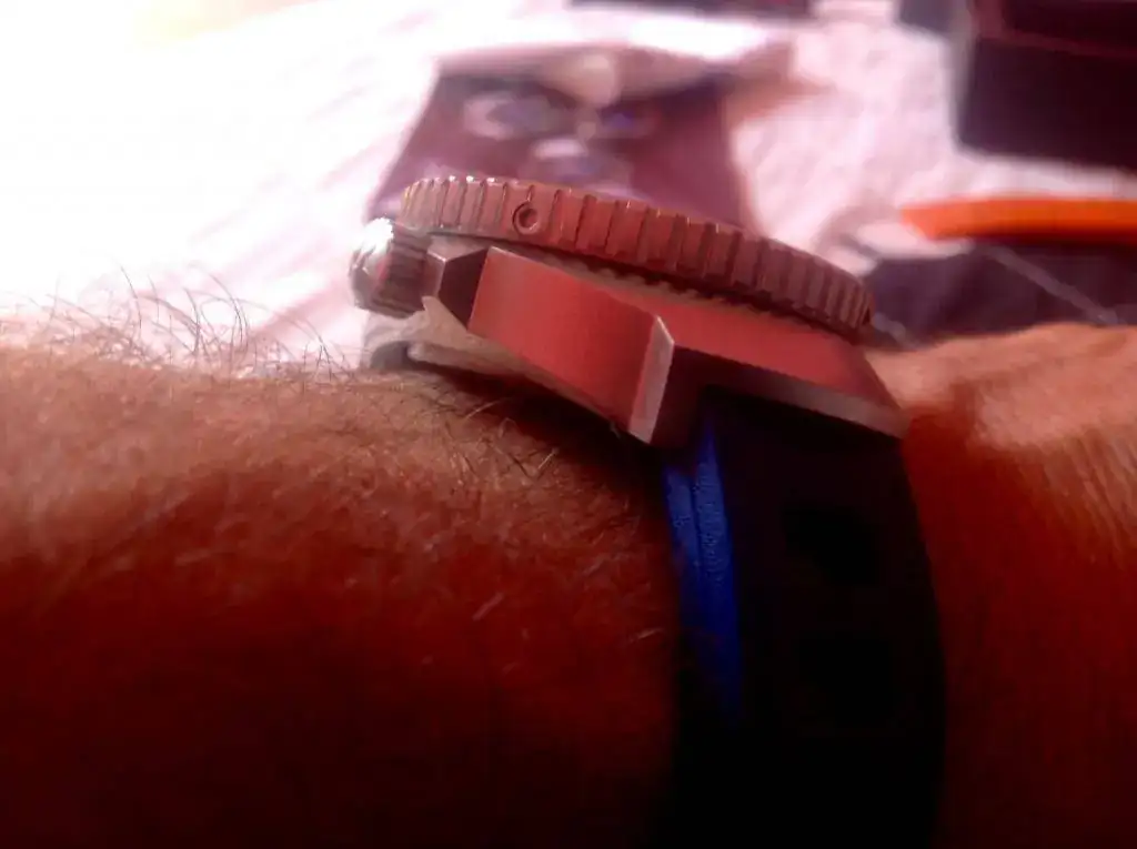 (me he tenido que aflojar la correa porque era un torniquete; el reloj es muy cómodo y asienta perfectamente en una muñeca de 17'5 - 18, pero el ajuste con la correa de caucho es complicado).