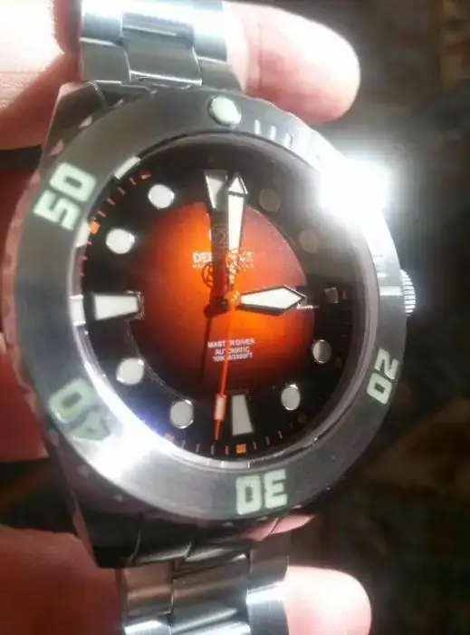 zafiro. Bisel unidireccional de 120 clics, Luminova espectacular. Esfera anaranjada por el centro, que hace un efecto