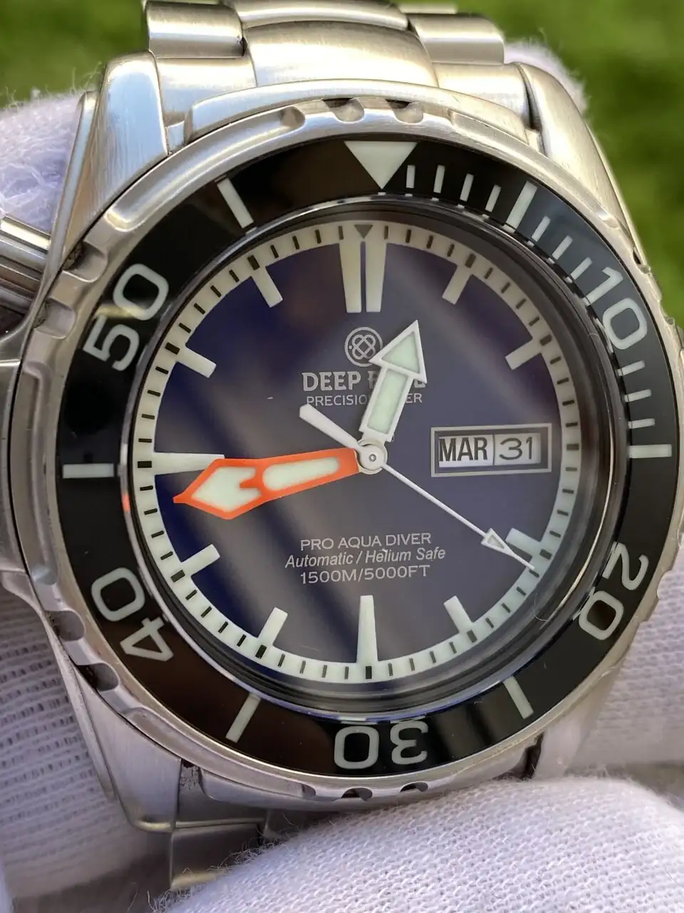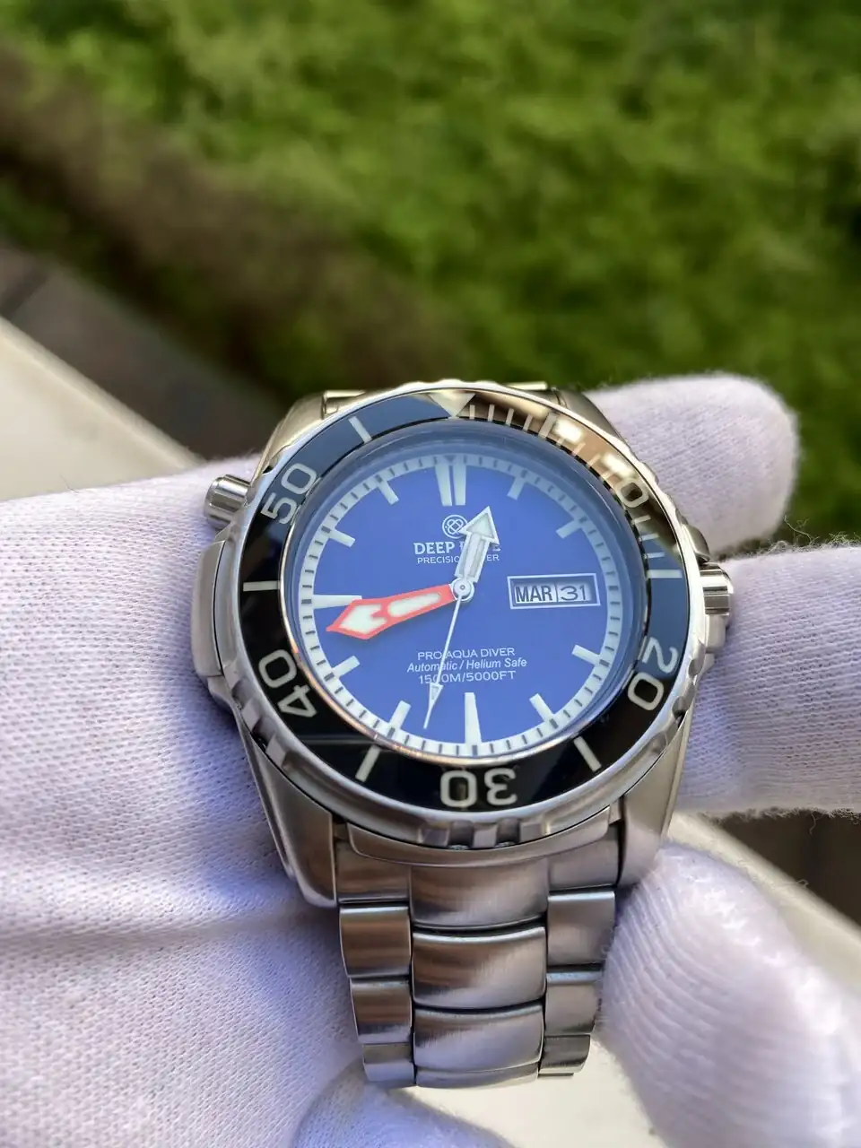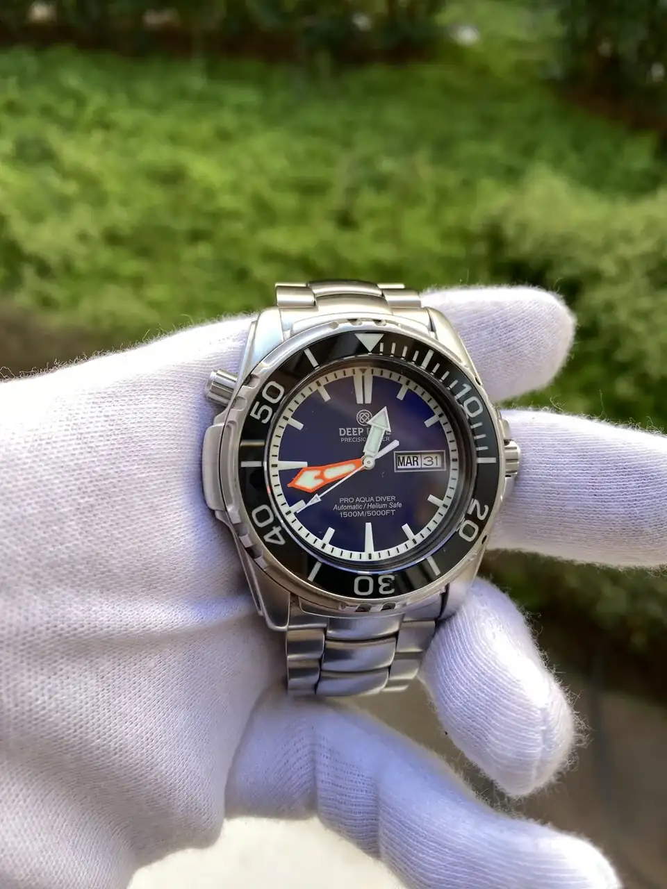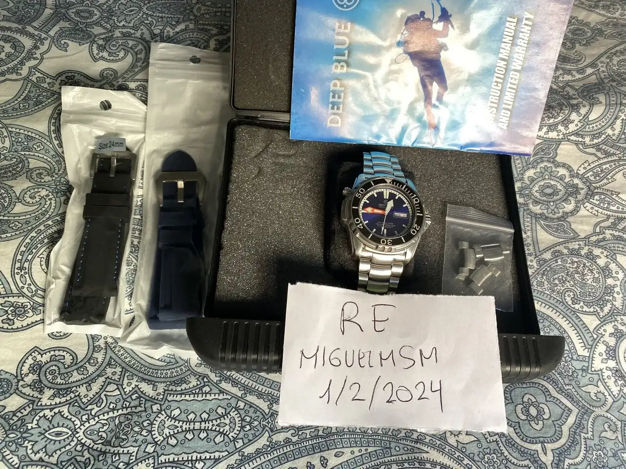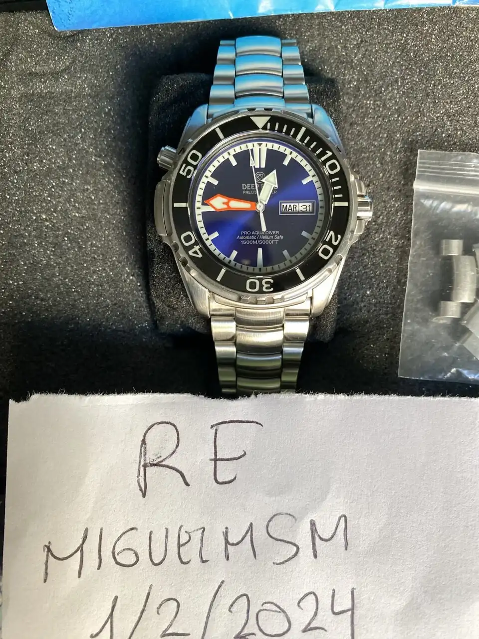 Pongo a la venta mi Deep Blue Pro Aqua 1500 esfera azul. El reloj esta en muy buen estado (sin ninguna marca reseñable), con las típicos pelillos de un uso cuidadoso, tiene cristal de zafiro y el bisel tambièn de zafiro, que están en perfecto estado., tiene balbula de helio a las 10. El lumen es impresionante. Se entrega con su caja y los papeles que traía. Tambien se entrega con el reloj dos cauchos nuevos sin estrenar uno azul y otro negro con pespunte azul y por último se entrega el armis original ajustado a muñecas de 18cm con los eslabones sobrantes.
