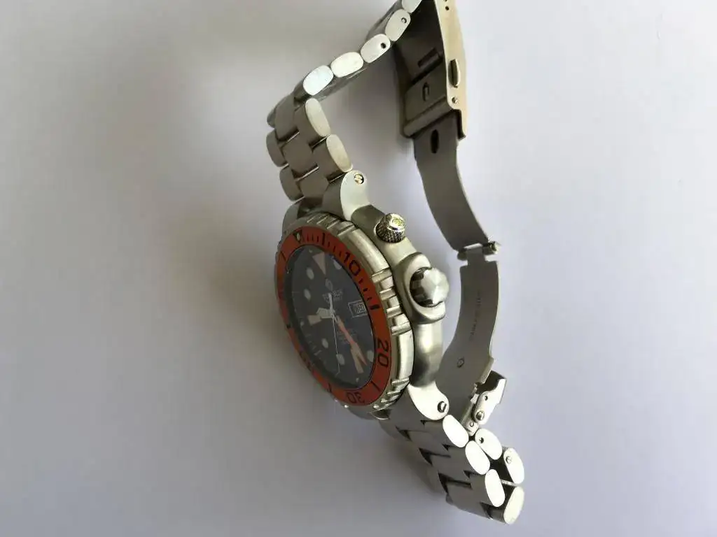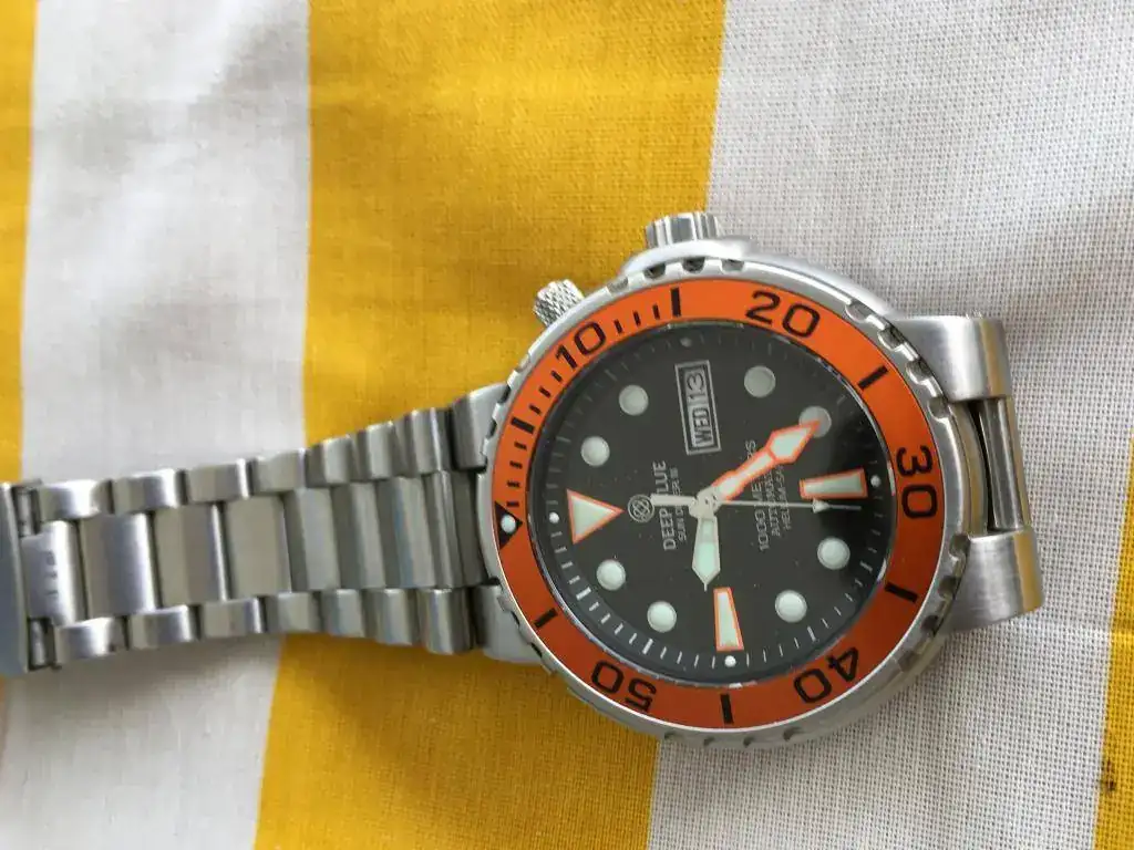 El reloj ha tenido muy poco uso (si lo he bañado en el mar y en la piscina) y está en muy buenas condiciones. La estética del reloj, con el contraste del naranja del bisel y el negro de la esfera, es muy atractiva. Buena marcha.