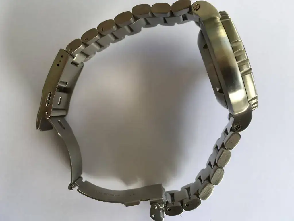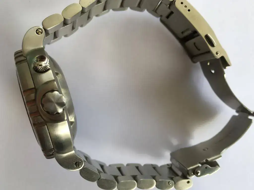 Caja y armis de acero 316L, con unos terminados buenísimos. Fondo roscado ciego y válvula de helio manual a las 2. Corona roscada.