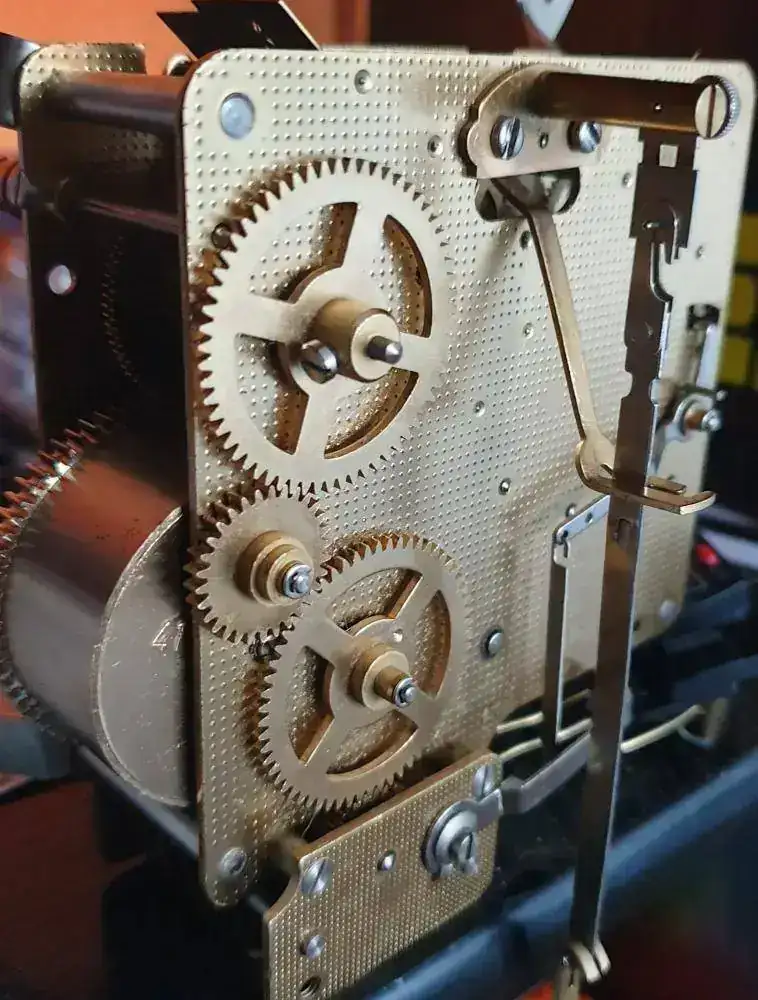 Asi que al retornar la rueda de escape a su mecanismo original resulta que el reloj ha perdido su exactitud, su largo recorrido del pendulo y la soneria esta muda. No soy profesional, soy aficionado, y he probado casi todos los ajustes posibles del ancora y lo que he conseguido es que el reloj funcione con un recorrido del pendulo minusculo, nada que ver con lo que tenia.