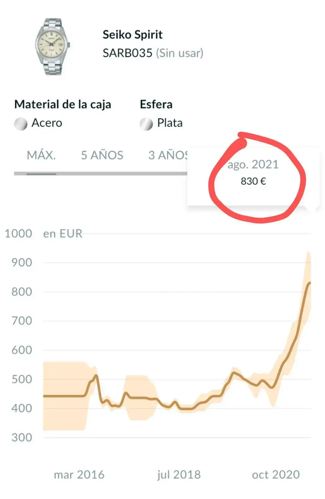 El problema es que también se me va un pelín de precio. Creo que hace apenas un par de años se podía conseguir por 400 y pico euros, pero debido a que fue descatalogado en 2018, a medida que se fue agotando el stock, y dado que es un reloj muy bien considerado y querido, ha ido subiendo exponencialmente de precio hasta alcanzar una media de 800 y pico euros actualmente