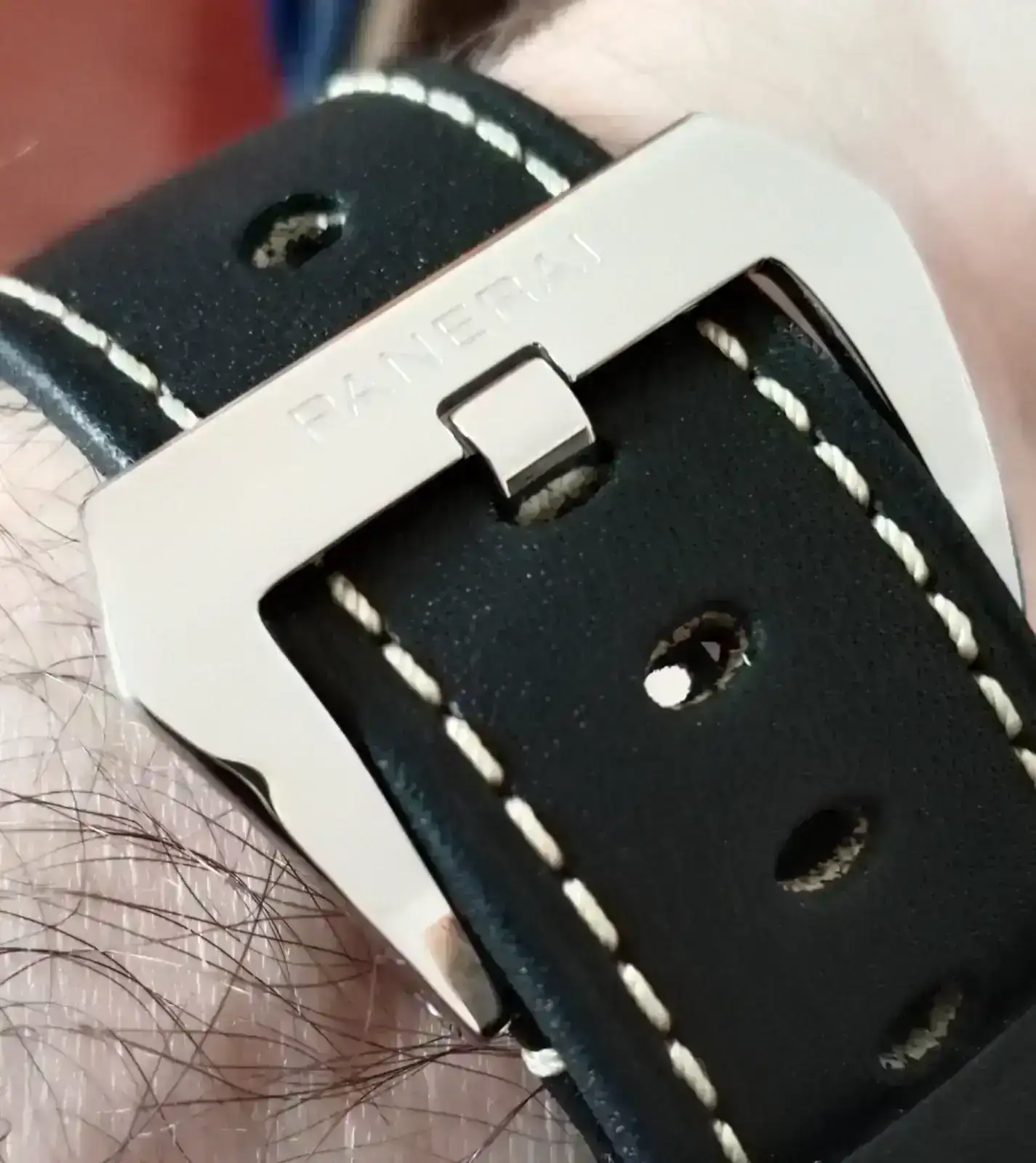 La correa de piel es muy cómoda y le queda perfecta con ese pespunte de color beige combinando con el beige de los índices y agujas. Los 27/22 de ancho es tan impresionante como complicado ... el día que tenga que reemplazar la "correita" o me gasto los 260€ "de nada" que cobra Panerai, o no sé qué voy a hacer 🤣