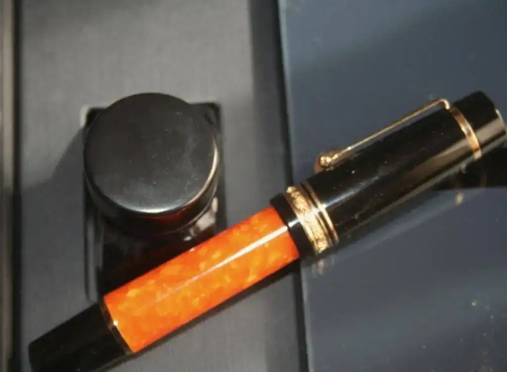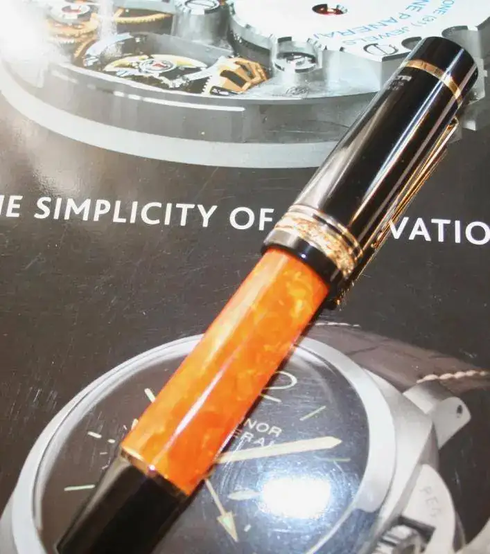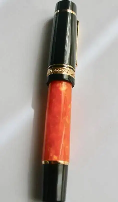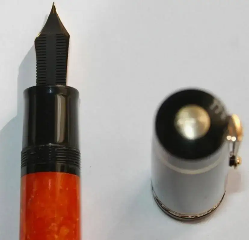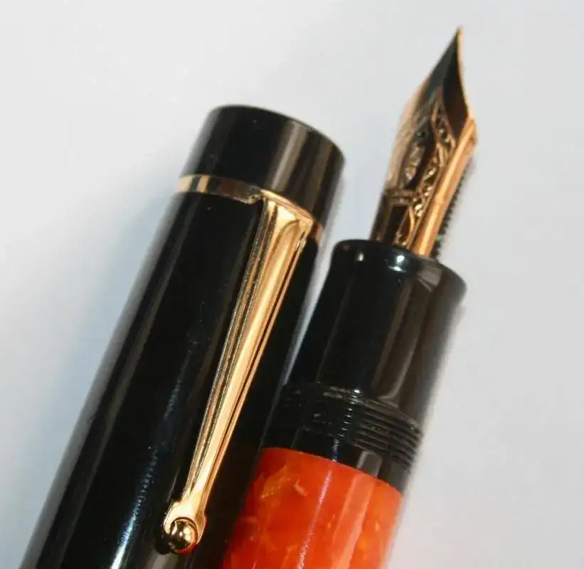 No hace falta que dé muchos detalles porque es totalmente conocida por la afición. Resinas negras y naranjas, adornos de plata, bañados en oro, en este caso. El plumín es un F de oro en un solo tono y de 14kt (estoy escribiendo y estoy sufriendo). El modelo es la oversize. El plumín es muy suave, como es tradicional, y escribe que da gusto...