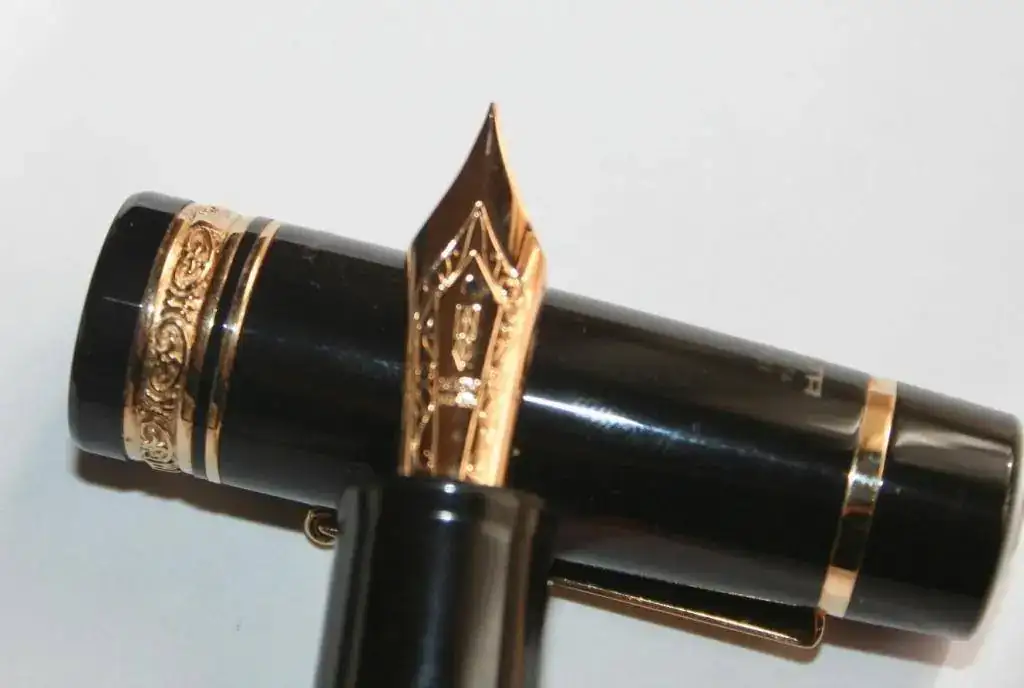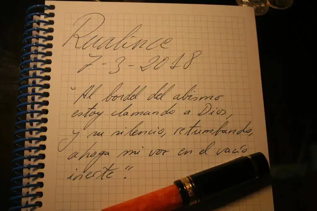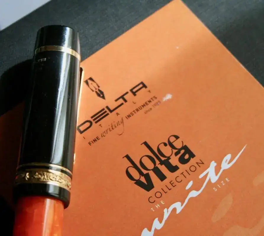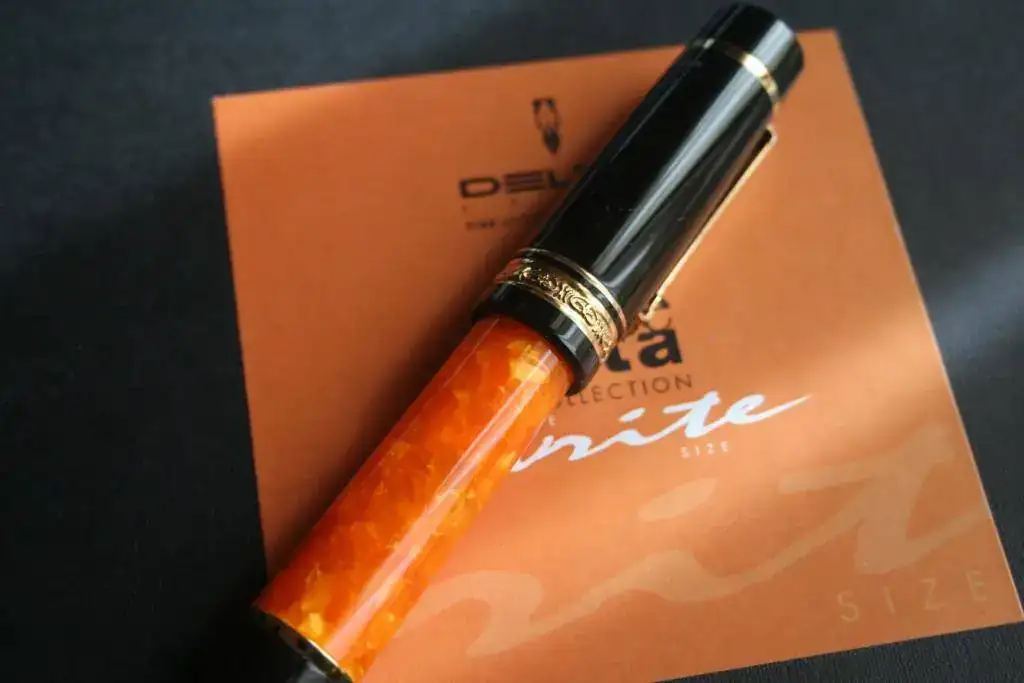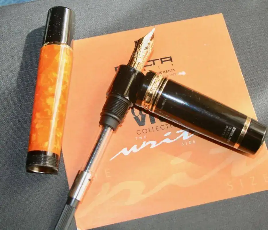 No hace falta que dé muchos detalles porque es totalmente conocida por la afición. Resinas negras y naranjas, adornos de plata, bañados en oro, en este caso. El plumín es un F de oro en un solo tono y de 14kt (estoy escribiendo y estoy sufriendo). El modelo es la oversize. El plumín es muy suave, como es tradicional, y escribe que da gusto...