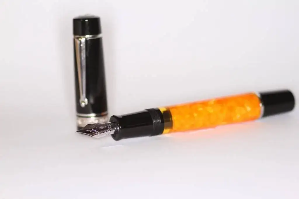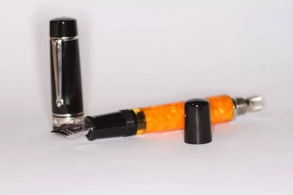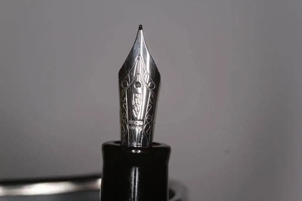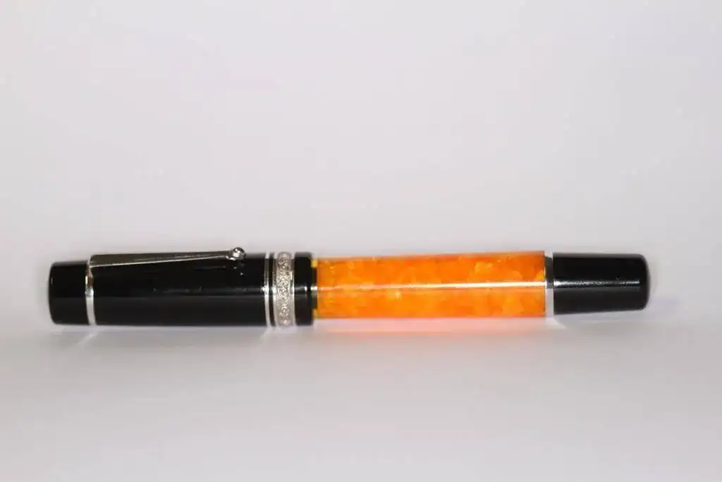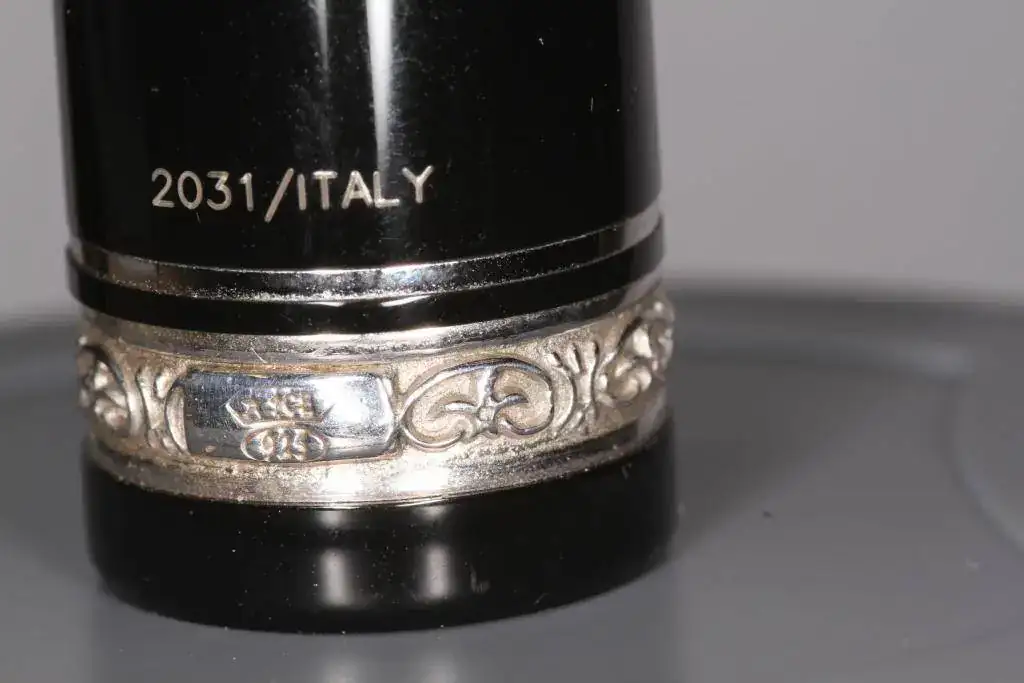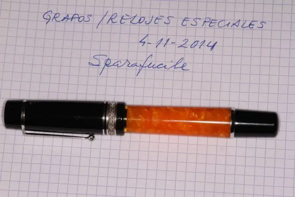 Ofrezco esta pluma, verdadero buque insignia de la casa Delta, la Dolce Vita "Stantuffo", o sea, el modelo de Dolce Vita medium size que funciona con el sistema de carga de émbolo de pistón, que se acciona tras retirar un tapón ciego a rosca del culote. Va dotada de un plumín de oro de 14 k rodiado, con punto de escritura F muy suave. El modelo está realizado en resina acrílica y celuloide torneado, con capuchón a rosca (el anillo que adorna el capuchón es de plata), en el que figura la inscripción con la numeración de la pieza, ya que se trata de una serie numerada. El alimentador es de ebonita.