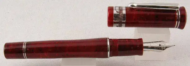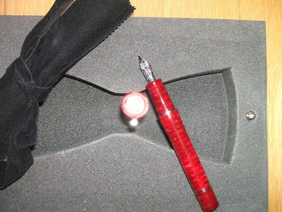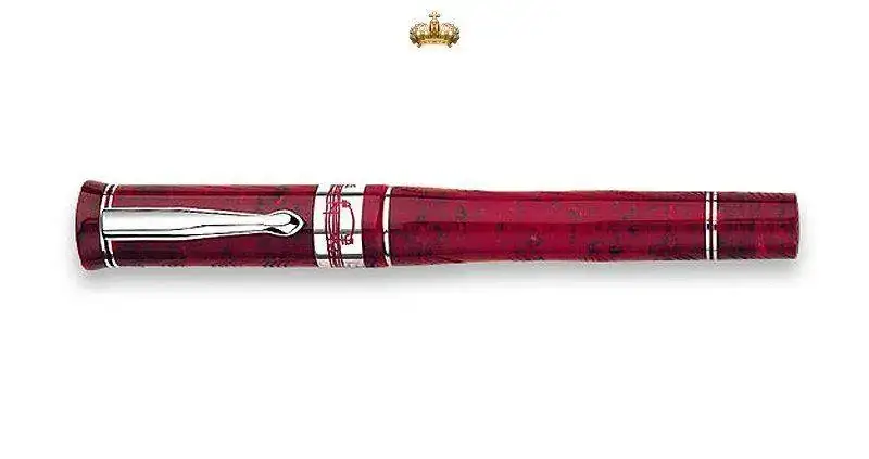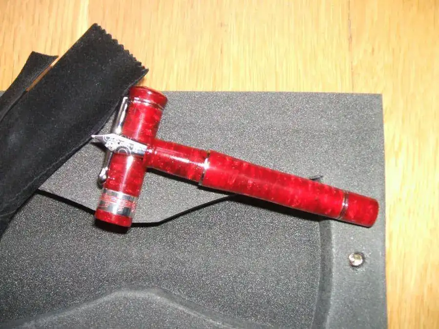 La resina roja que con los cambios de luz se hace más bella aún, los detalles de plata, el originalísimo clip, la banda con un pentagrama y notas musicales del capuchón, el precioso plumín de oro rodiado...