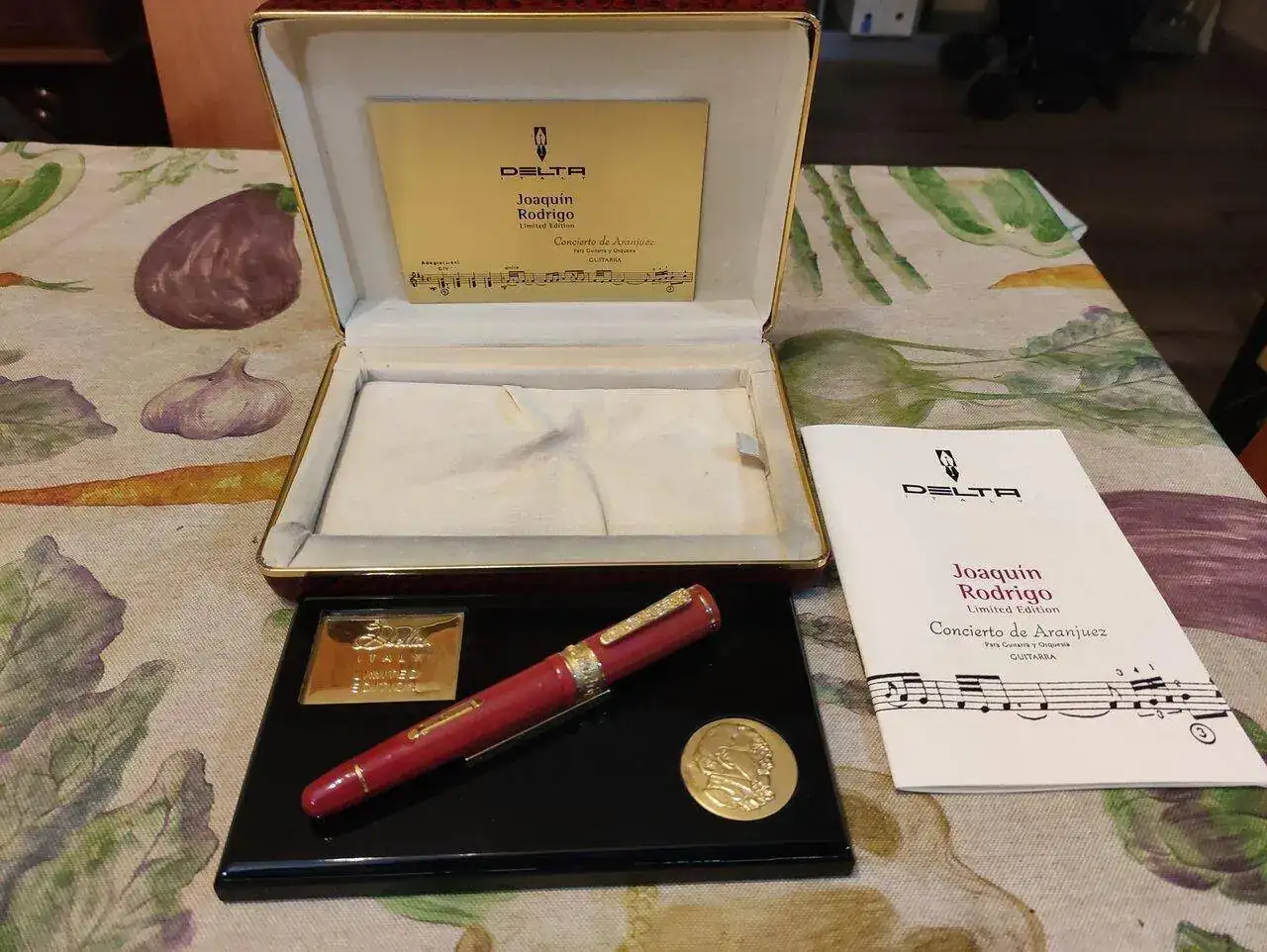 Los elementos de escritura Joaquín Rodrigo están presentados en un elegante estuche personalizado y personalizado con un medallón vermeil o plata maciza 925‰ bruñida, en la corona del capuchón podemos ver el anagrama de la marca grabado sobre un botón de plata maciza chapado en oro (vermeil); en el clip, también de plata vermeil, observamos un pentagrama con notas musicales y en el aro, también de plata vermeil, "JOAQUÍN RODRIGO", grabado en bajorrelieve. En el cuerpo podemos ver "DELTA", "ITALY", "JOAQUÍN RODRIGO", "SPECIAL LIMITED EDITION" y el número de pieza sobre el total fabricado; el plumín es de 18K., y el sistema de carga es por medio del uso de la palanca lateral que lleva grabado “EDIZIONE 2002”.