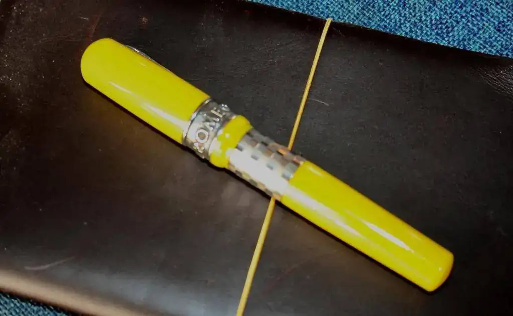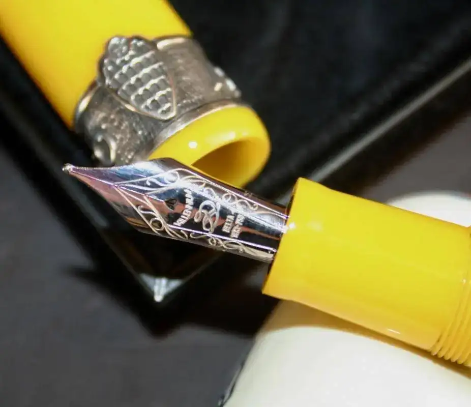 El plumín es el denominado “MILLENIUM” de 18K., punto M, con baño de platino para hacer juego con la plata maciza; el sistema de carga es mediante cartucho y/o convertidor de émbolo. Se manufacturó en colores amarillo, negro y rojo y se puso a la venta en el año 2001, manteniéndose en fabricación hasta finales del 2007. Esta es la amarilla.