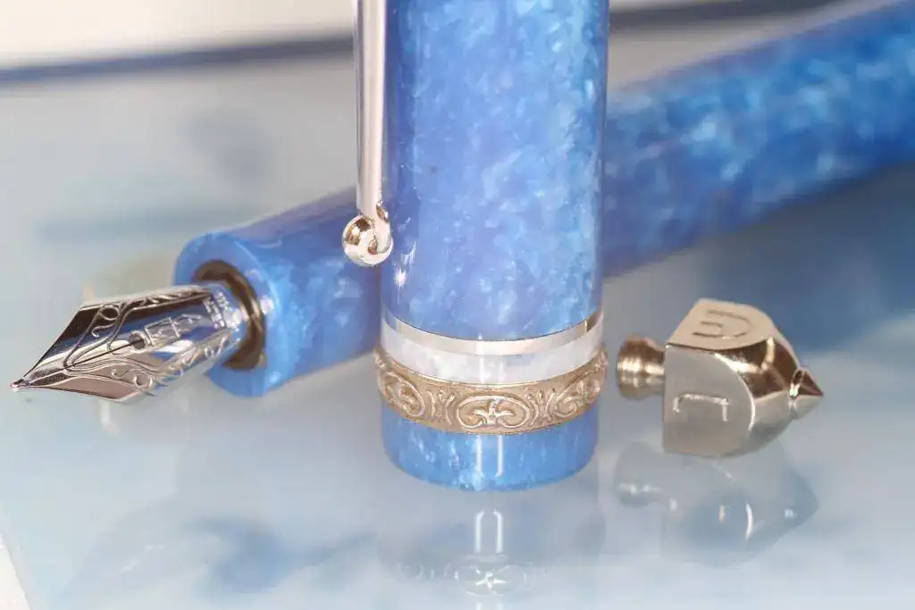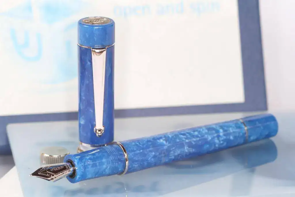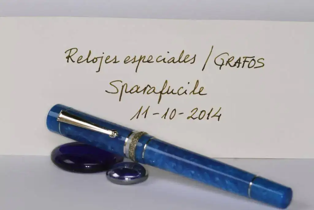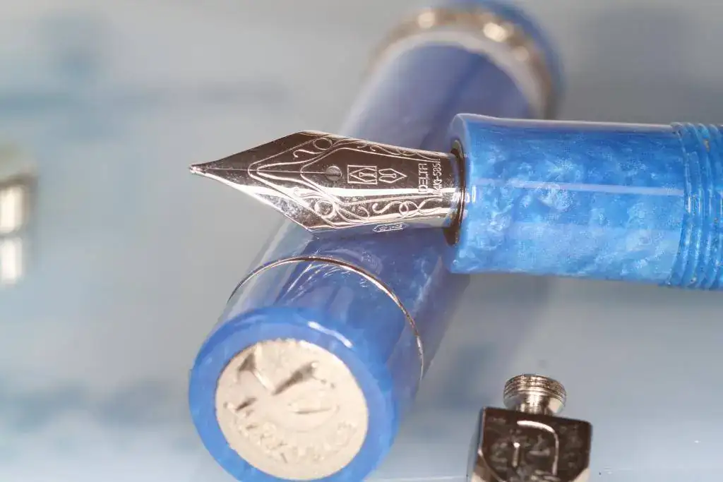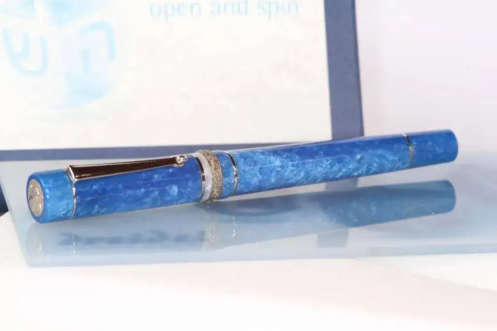 Debido a que apenas la uso, pongo a la venta una interesante pieza de mi colección. Se trata de una estilográfica de marca italiana Delta perteneciente a la serie "Dreidel". Está fabricada en resina de ciolor azúl jaspeado y viene provista de un plumín de oro 14 K (monocromo rodiado) de punto M, y anillos y adornos rodiados. Sistema de carga cartuchos estándar o convertidor (incluido en la oferta).