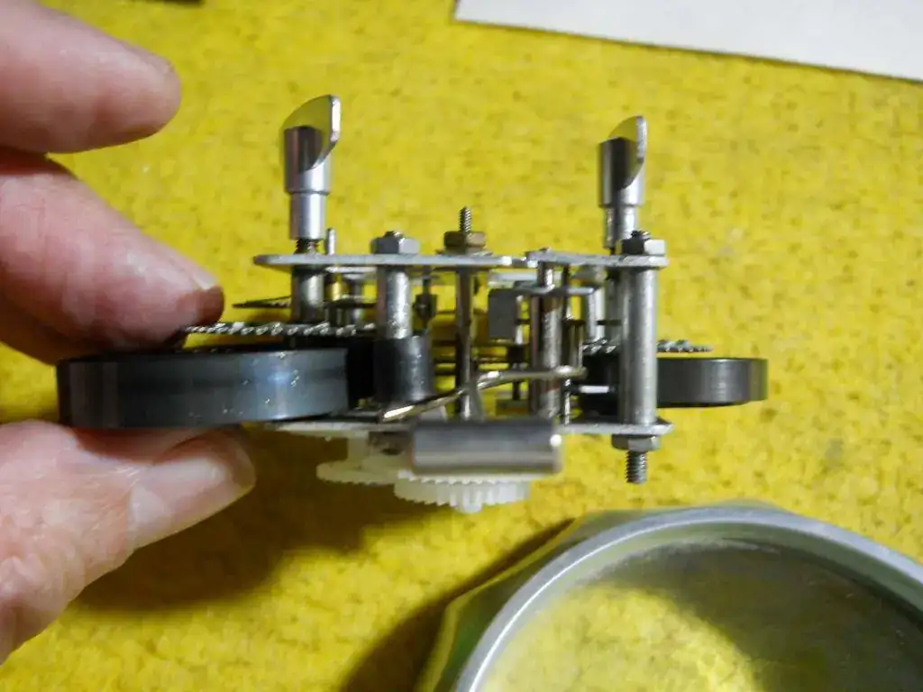 Por ello el desarmar ya fué un lío porque, pese a que había descargado ambos resortes (cuerdas), cuando separé las dos platinas las cuerdas que todavía tenían algo de carga salieron disparadas...y con ellas salieron también los engranajes... Cosas de novato. (creo que no perdí ninguna pieza)