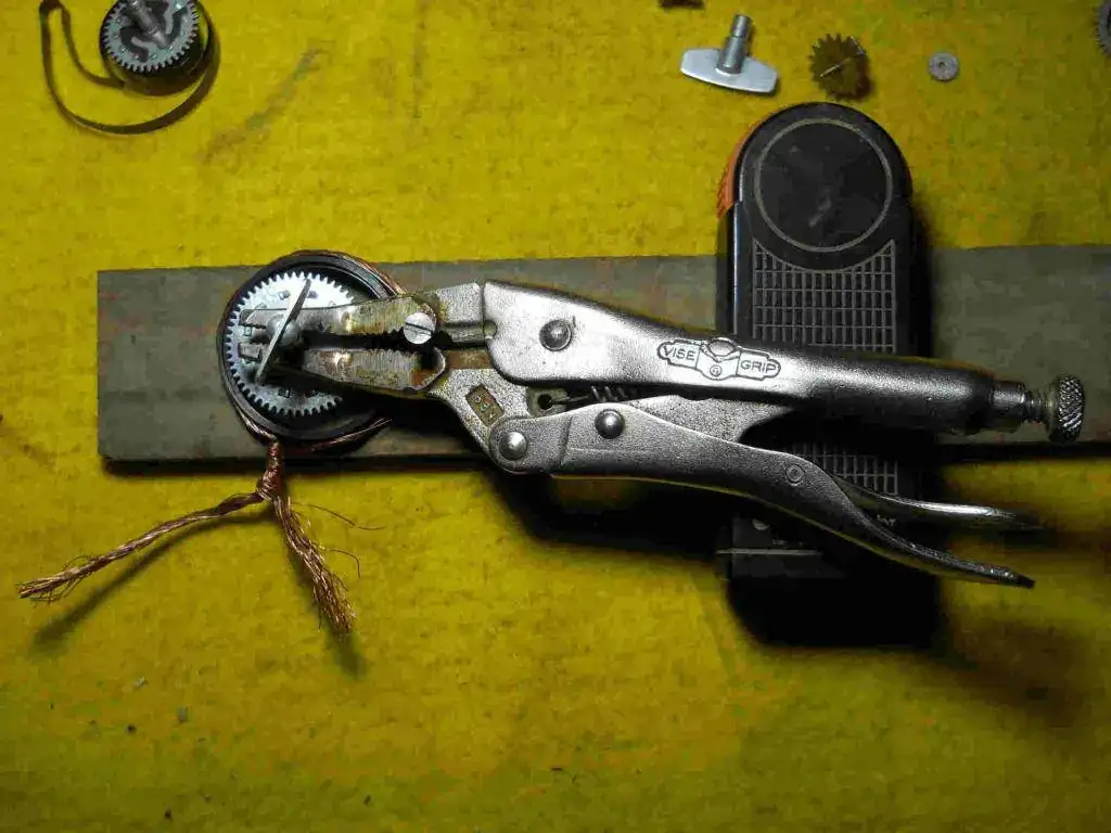 es una "pinza de fuerza" con la que muerdo el eje de la cuerda para que "no gire loco", previo haber colocado la pinza de fuerza abrazando los tornillos, para poder colocar la atadura sin problemas.