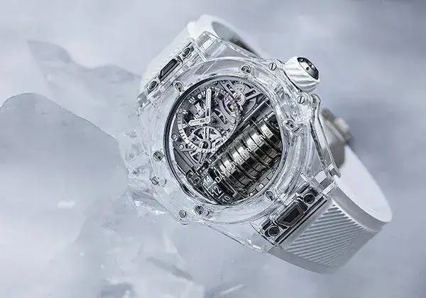 En contraposición al calibre de carbono, presentamos una versión completamente transparente de cristal zafiro, limitado a 200 piezas. Líder en el modelado a gran escala del zafiro, el material más duro y resistente después del diamante, Hublot ha alcanzado un nuevo logro con esta caja cristalina cuyo abombamiento sigue la curva de los barriletes cilíndricos. Todos los elementos de cristal de zafiro se abomban a la altura de los cilindros y crean un efecto lupa sobre el indicador de la reserva de marcha. Una proeza de la ingeniería, pues se trata de un material extremadamente duro y muy complejo de mecanizar.