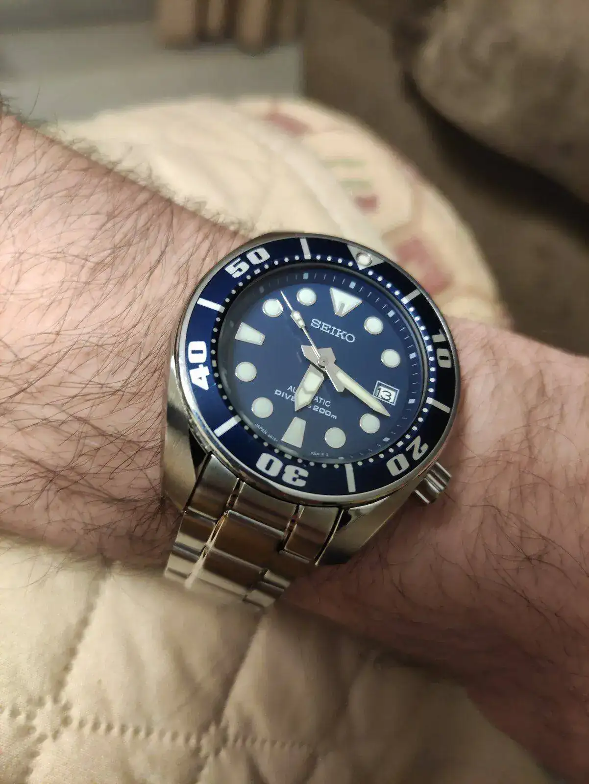 Decidido a adquirir otro reloj estas Navidades y tras muchos días de pensar y repensar, cuando parecía que estaba totalmente decidido por un Bulova Lunar Pilot, empecé a leer sobre los divers de Seiko. Aunque en principio la estética de la mayoría de divers no me vuelve loco, empezaron a hacerme tilín un par de modelos bastante populares, el Tortuga y el Samurai. Pude probarlos en el Corte Inglés y, aunque contra todo pronóstico, me gustó más en muñeca el Tortuga, no acababa de estar plenamente convencido. Fue entonces cuando un amigo aficionado a los relojes me habló del Sumo y acabé por decidirme. Encontré que un compañero del foro, tenía uno, del color que más me gustaba, así que contacté con él y dejamos cerrado el trato de inmediato.