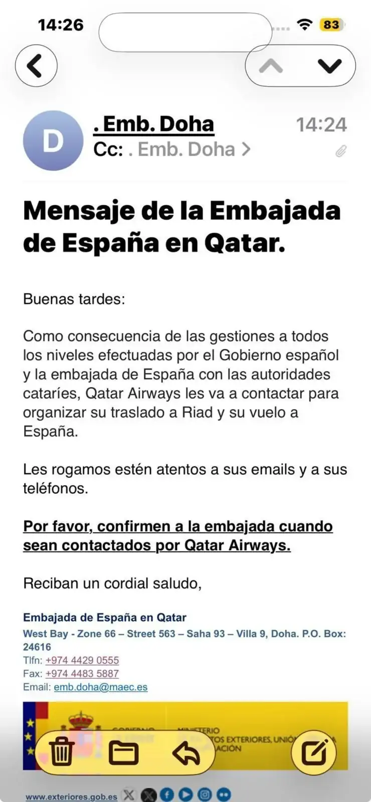 Ánimo!!!Qué Notición Jose, no sabes cómo me alegro , te he escrito un whatssup pero irás en el avión todavía , aquí seguimos con el espacio aéreo cerrado , algo que no entendía hasta ahora que me han comentado que al parecer la Base aérea de Qatar es la más grande de todos los países cercanos , según palabras de un qatari ( es la madre de las bases) de la zona , por lo que los Iraníes están fijados en nosotros , espero que la diplomacia haga su trabajo y dejen un corredor sanitario para que podamos salir de aquí de una vez .