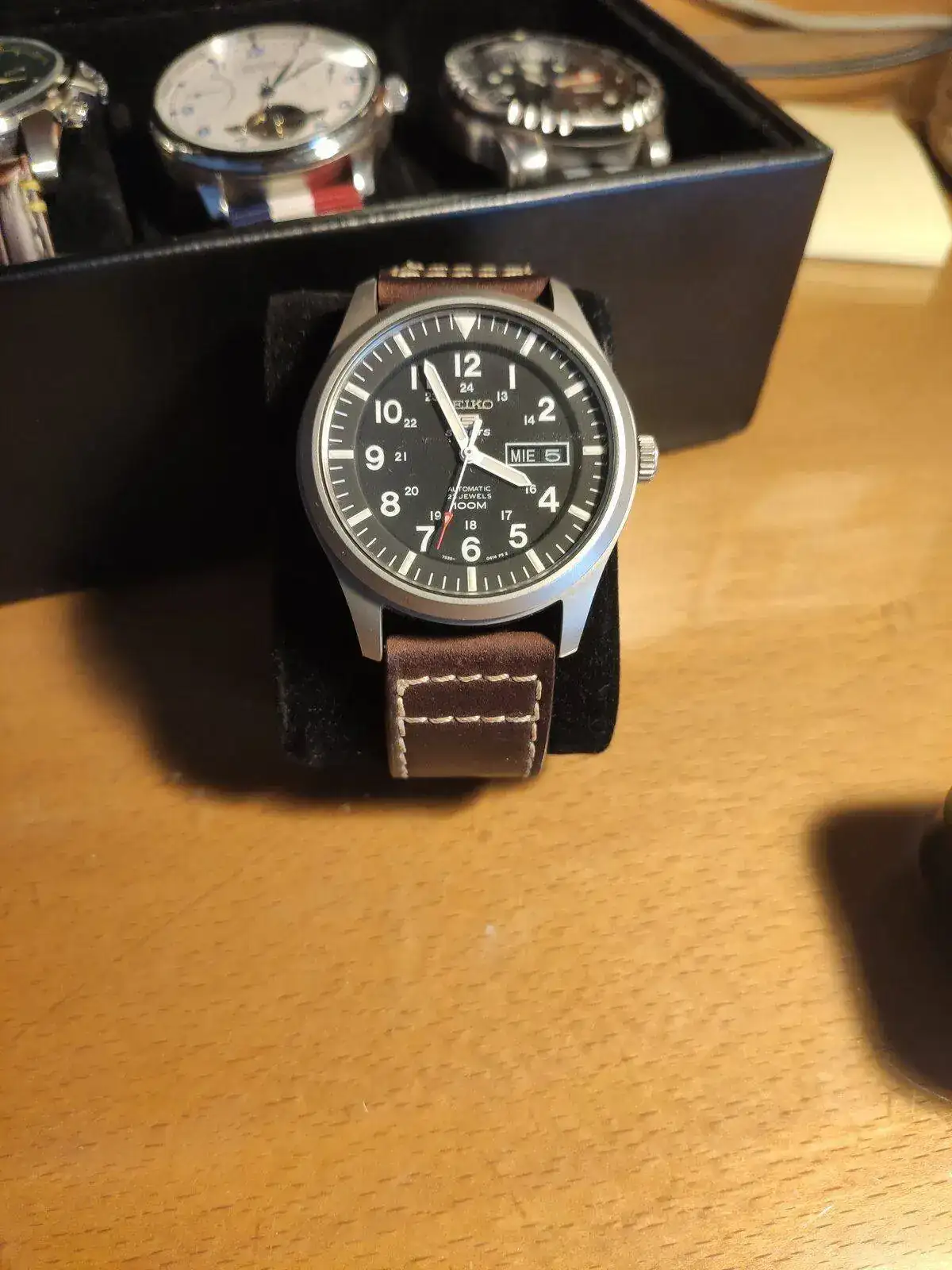 A raíz del Certina y empezar a leer sobre relojes, me vino el interés por los relojes automáticos y entonces llegó un Seiko 5 military pero el de 38mm que creo que es el único que no he encontrado y poco después otro military pero esta vez el grande.