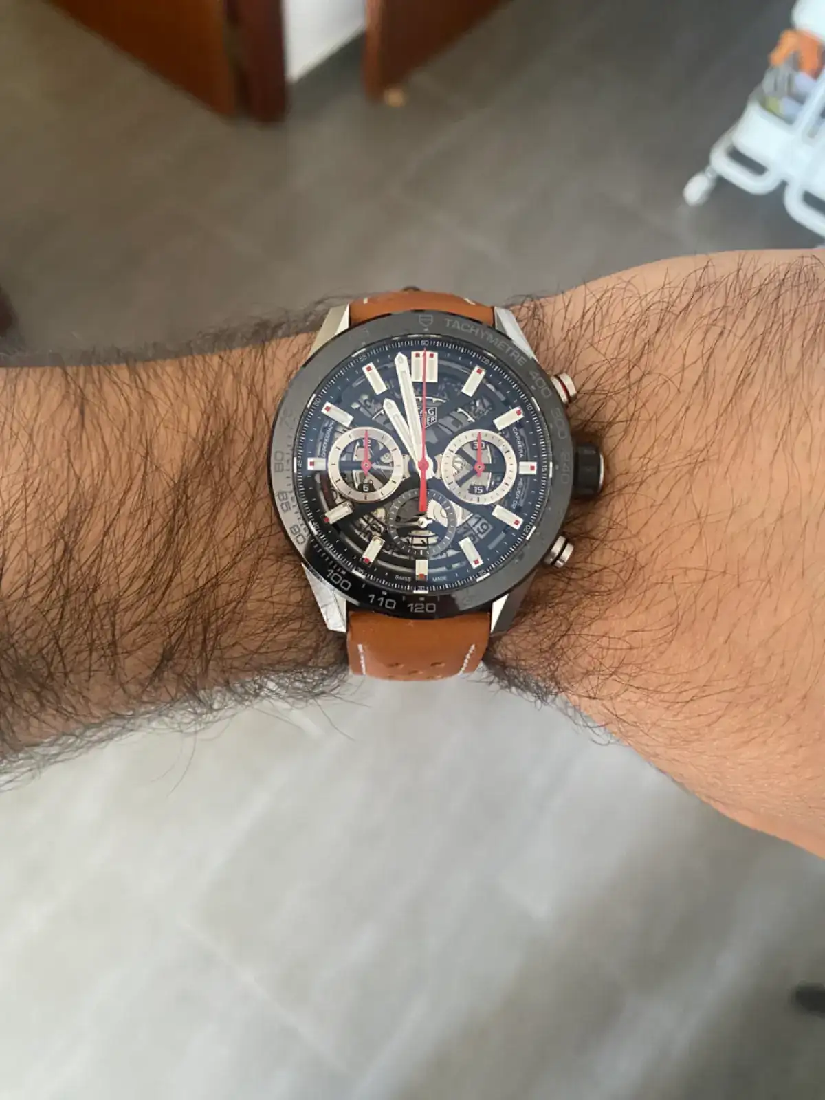 Soy propietario de un Tag Heuer Carrera Heuer 02 modelo CBG2010.BA0662, comprado nuevo el 03/2022 y con garantía hasta el 03/2027. El reloj me encanta tratándose de un CARRERA “diferente”, resultado también de la época en la que Jean-Claude Biver fue CEO en Tag Heuer: acabados espectaculares, un skeleton muy bien resuelto y 43mm muy ponibles en mi opinión. (Mi muñeca es de 16,5).