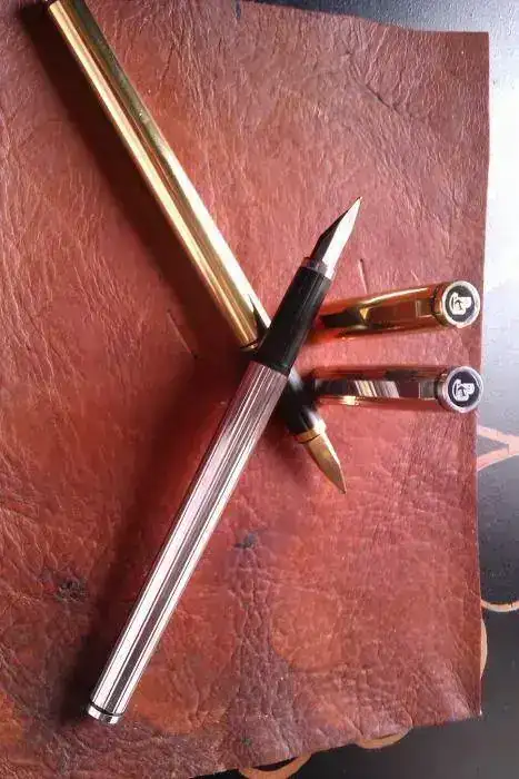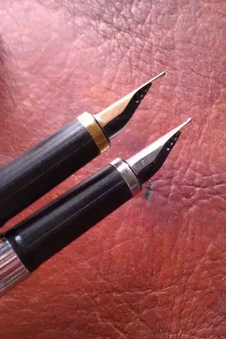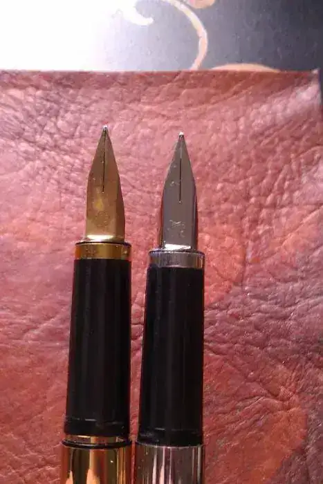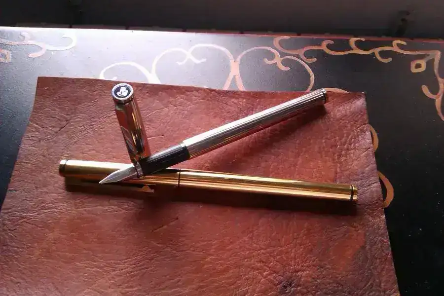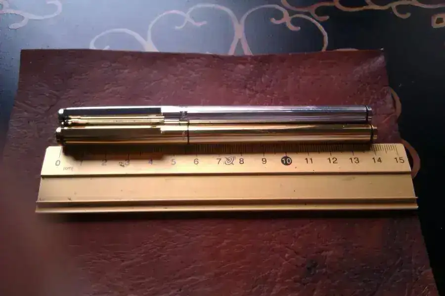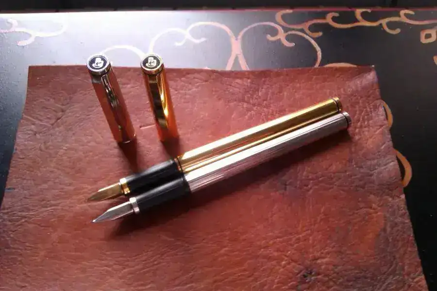 Bueno, bromas aparte, os presento dos Pelican que tengo desde hace tiempo, creo que sonde finales de los 90. Son el mismo modelo, denominado Signum, pero una acabada en chapado de oro liso y la otra en plata estriada. Ambas son extremadamente suaves en su escritura. La carga es por cartucho estándar o convertidor.