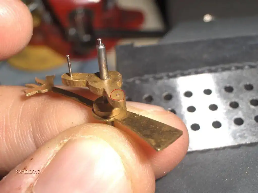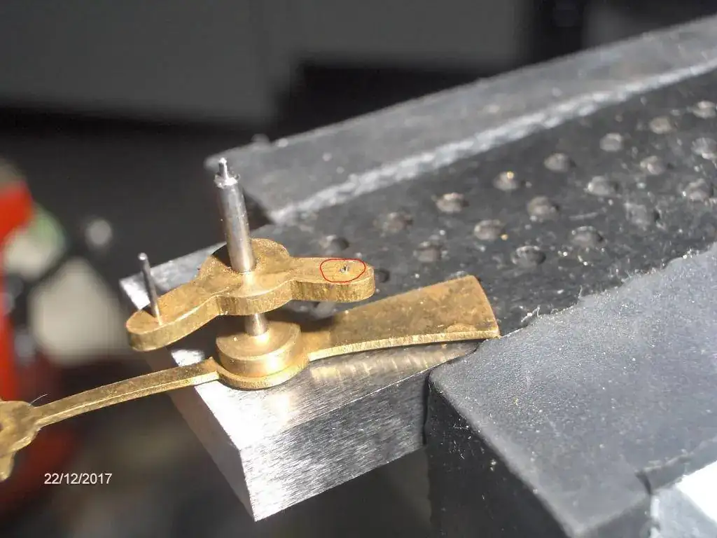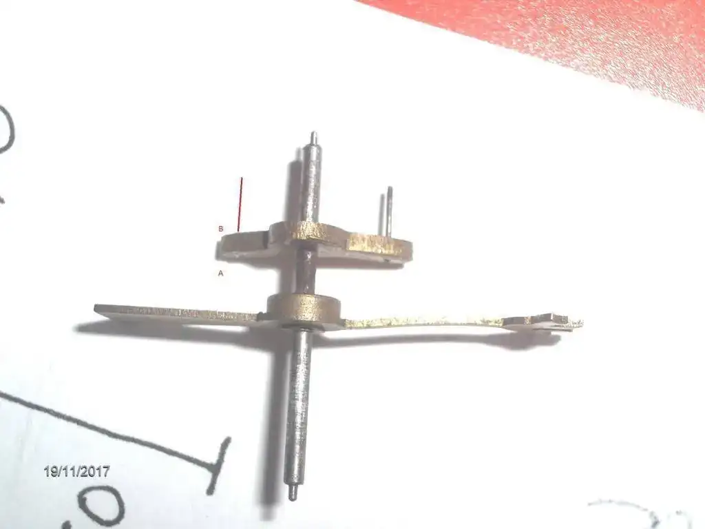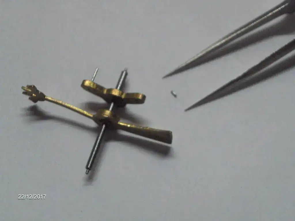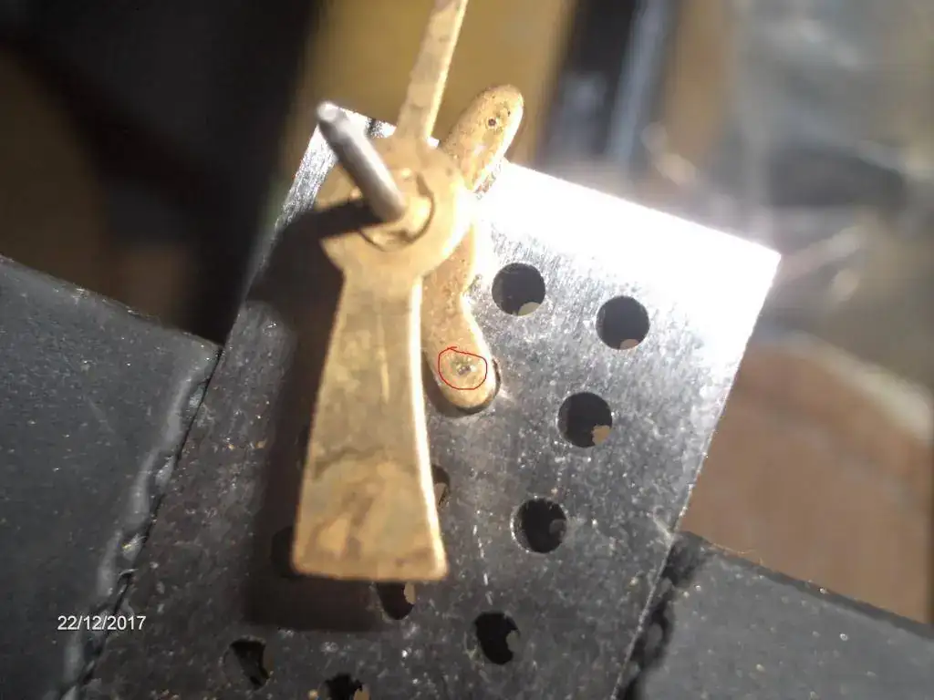 Aqui esta otra reparación, le falta uno de las "paletas" del ancora. Nada que no se pueda susitutir con varilla de pivotes "blue steel" o con una aguja. Nunca he cambiado una, espero que no de problemas el ajuste posterior, cualquier consejo lo agradeceré.