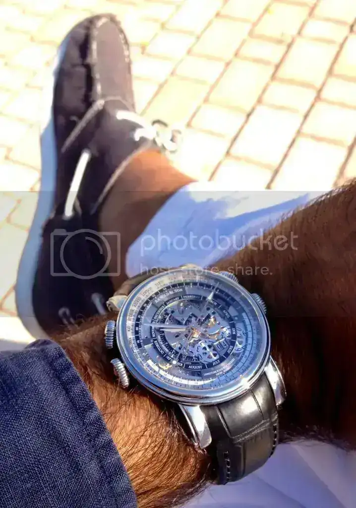 No no es un Schwarzenegger es una preciosidad con 6 agujas centrales capaz de ofrecer doble GMT (tres horas simultáneamente), hora solar, ecuación del tiempo, fechador a doble dígito, mes ... Ah!! incluso da la hora y los minutos.....