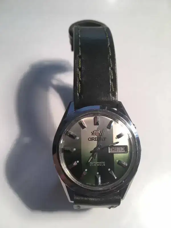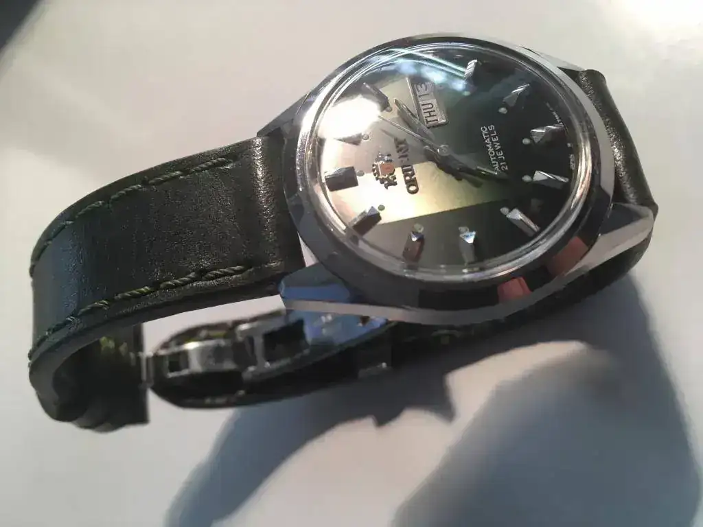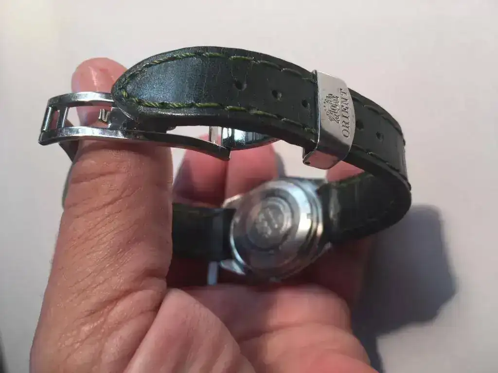 Incluso a este Orient que tiene su armis le busqué esta correa de cuero en verde a juego , y tuve la suerte de encontrar un desplegable de la marca que le queda de lujo.