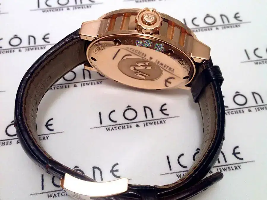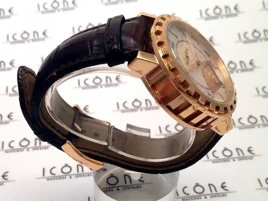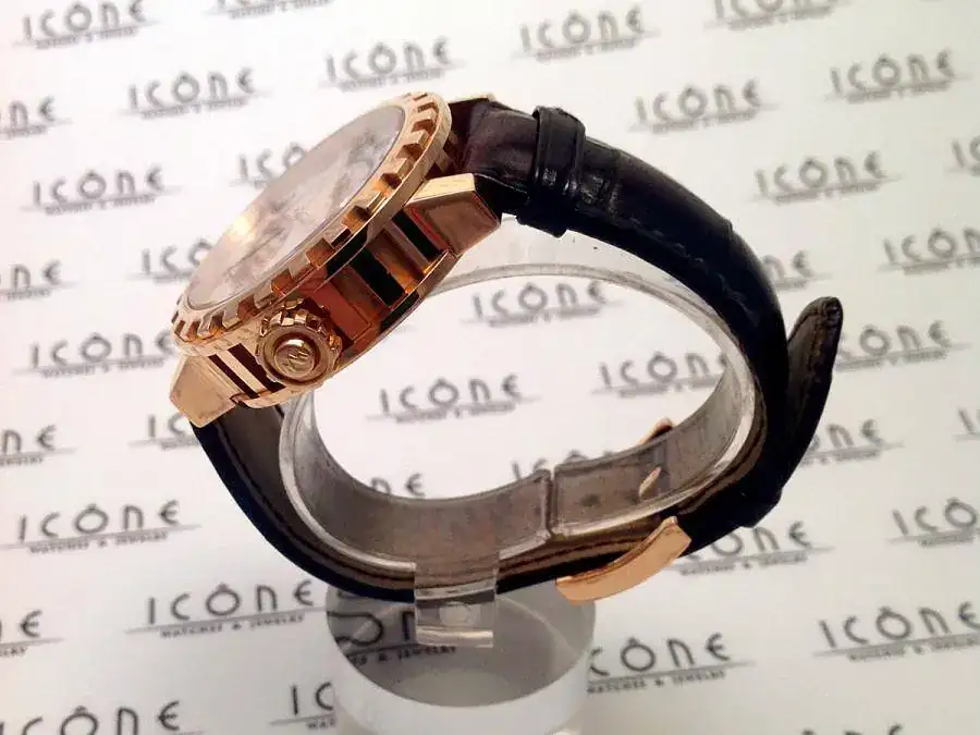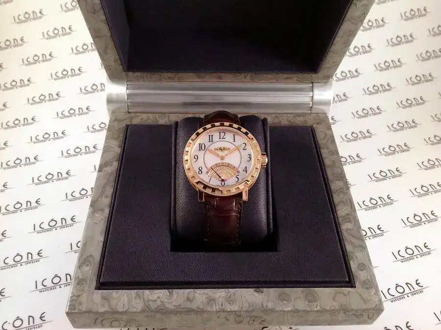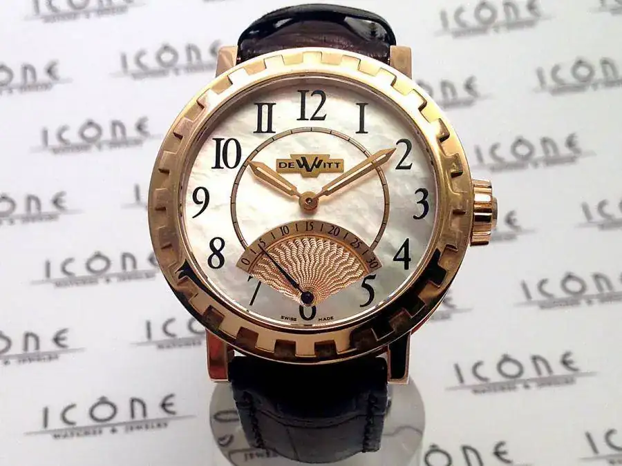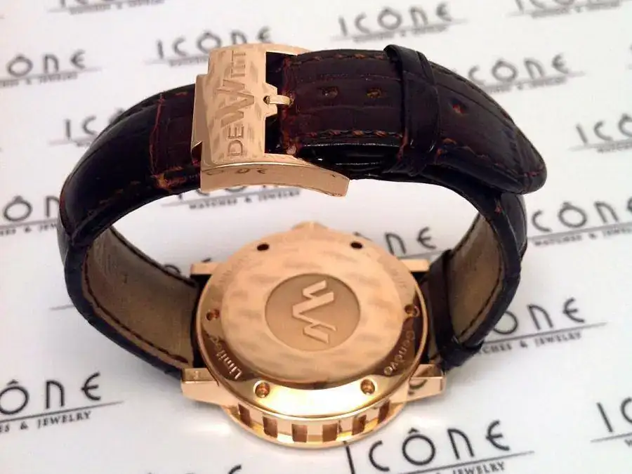 Las características del mismo son: Caja de oro rosa de 43 mm., calibre DW 1102 automático, retrógrado segundos (en suma de 30 segundos), Zafiro, correa de piel, hebilla original Dewitt oro rosa, esfera de Nácar blanco.