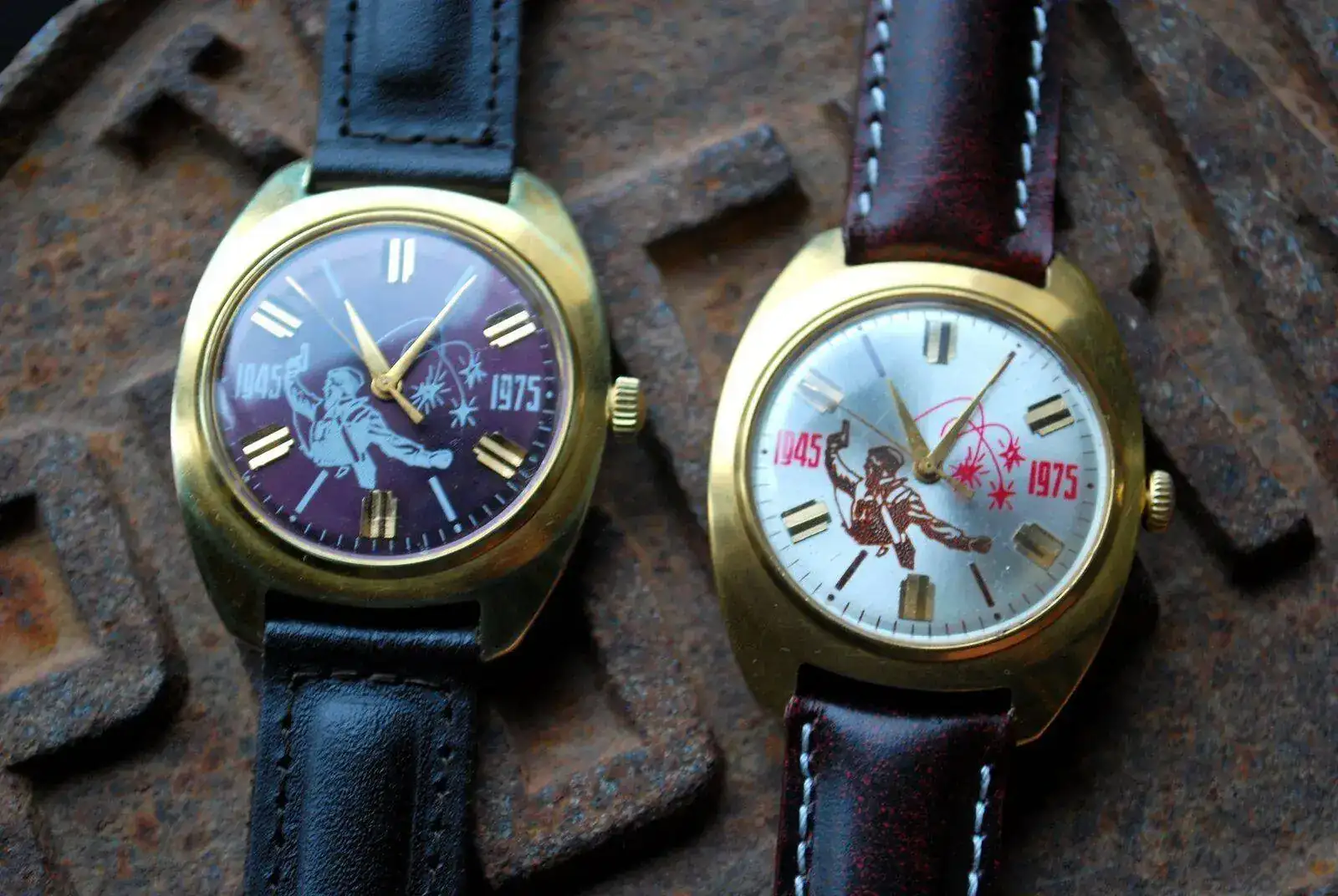 Saludos compañeros, hoy se celebra en Rusia y demás países del Este el día de la victoria y final de la Segunda Guerra Mundial, allá en 1945 , sirva esta pareja de Zims de 1975 con caja hermética como homenaje para ese día. el dial representa la orden de ataque del militar ruso al frente, más información de lo que representa la esfera en el enlace a pié de foto