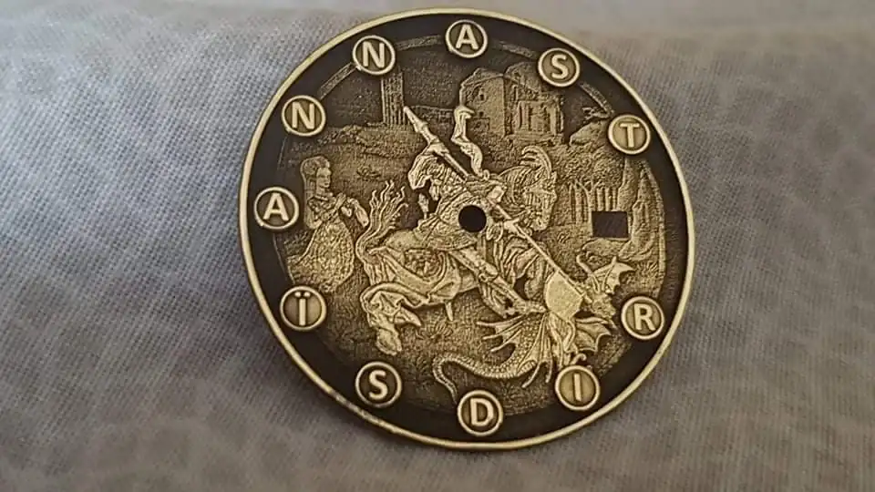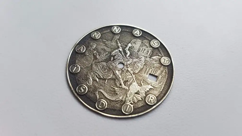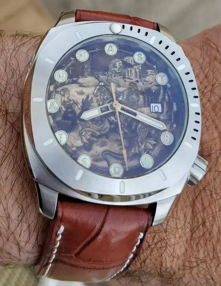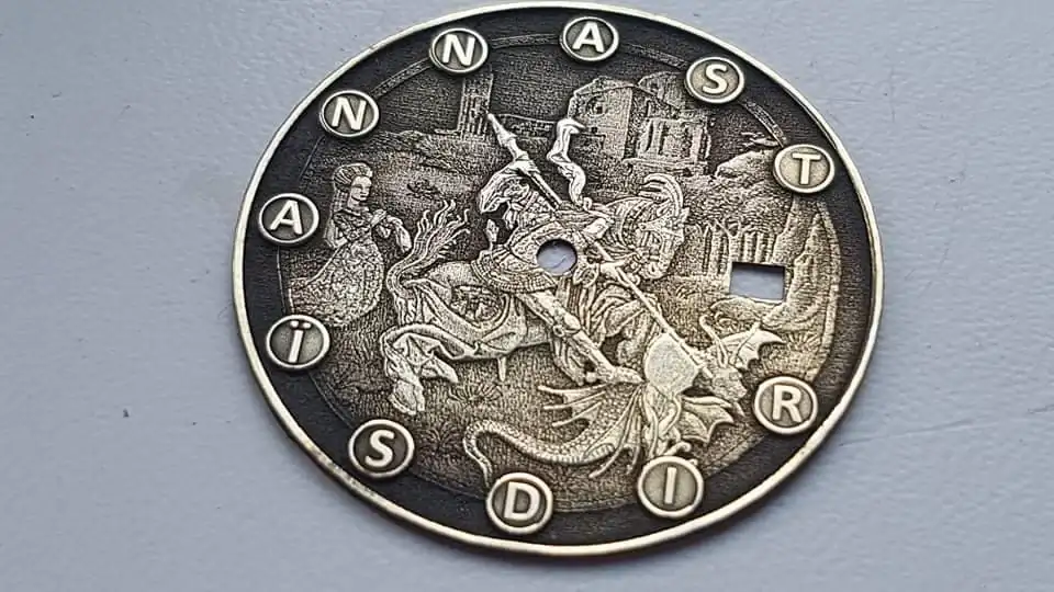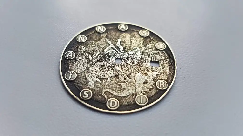 Lo hizo sobre un dial de acero , pero al ser un dibujo muy recargado , las iniciales de los nombres no había problema pero el dibujo no quedaba bien grabado.