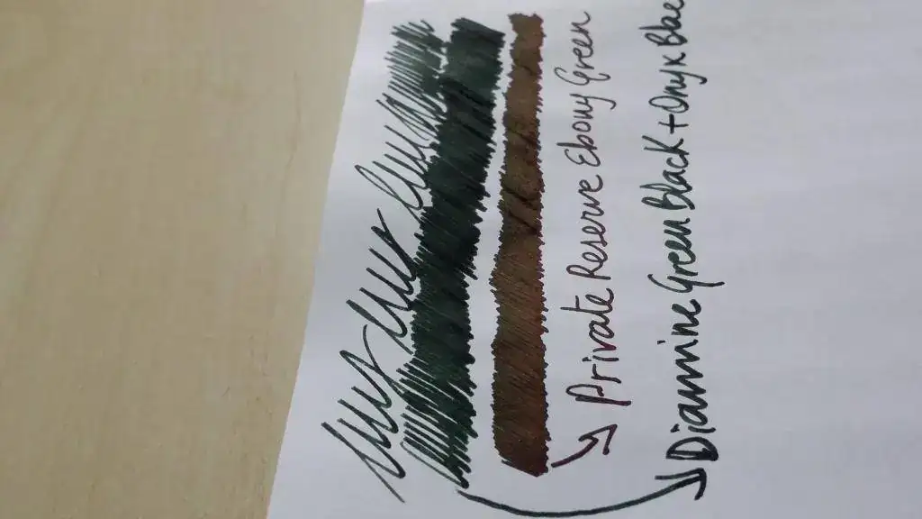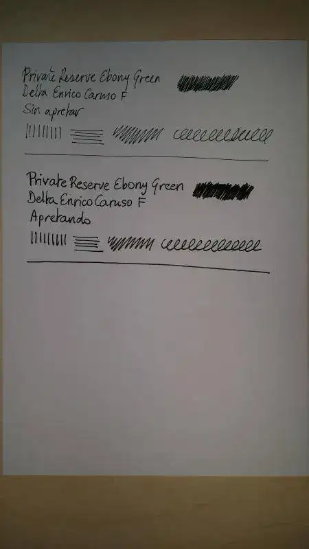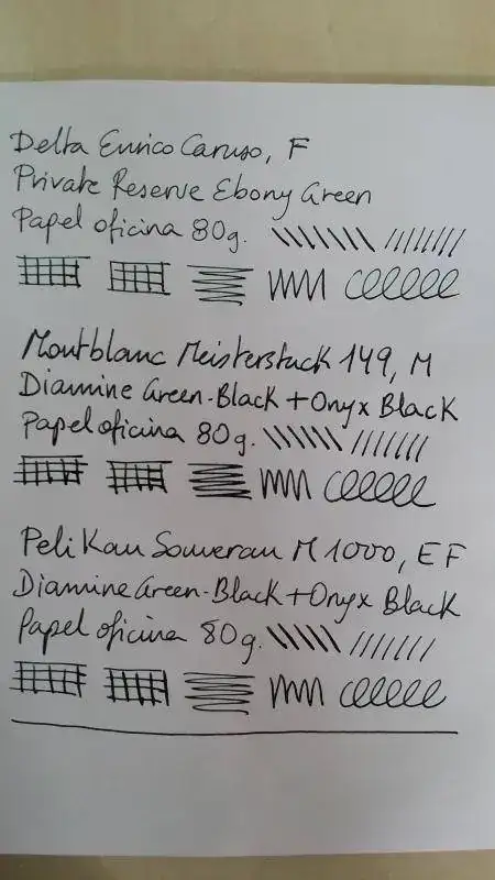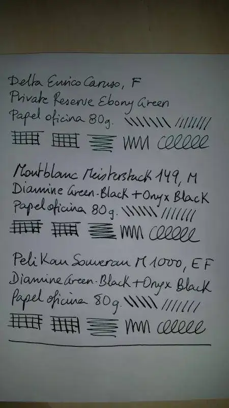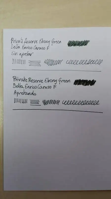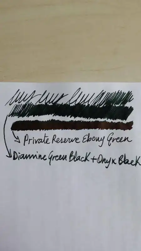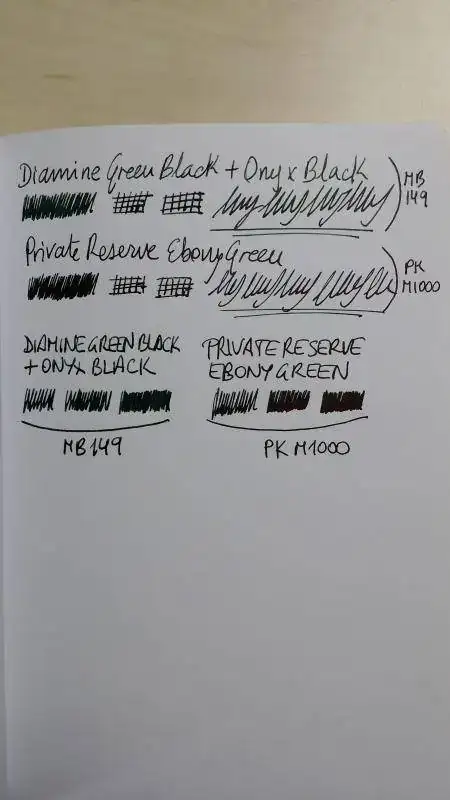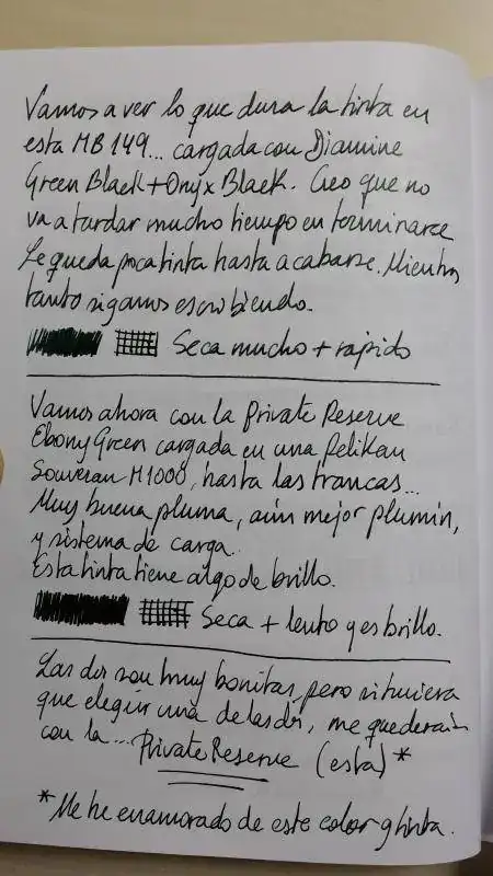 Acabo de cargar por primera vez una pluma con una tinta nueva para mi y que llevaba tiempo expectante por tener, la Private Reserve Ebony Green. Es un color precioso, pero me ha "decepcionado" en el sentido de que la esperaba mas oscura, parecida a la mezcla Diamine Green-Black + Onyx Black que ya tengo cargada en otras dos de mis plumas, en cambio es mas clarita, diria que es como la Green-Black sin mezclar. Creo que la Cult Pens (Diamine) Deep Dark Green es mas oscura que esta Private Reserve Ebony Green, pero no puedo asegurarlo, no tengo a mano para hacer pruebas comparativas. Lo que esta claro es que tendre que mezclarla con Private Reserve Velvet Black para llegar a la tonalidad oscura que deseo, como tuve que hacer con la Diamine Green-Black.