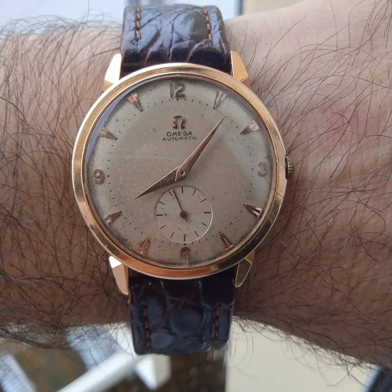 En primer lugar voy con los dos vintage heredados, relojes que utilizo solamente para ocasiones especiales así que salen pocas veces, especialmente el Omega de oro sale muy poco. Se trata de un Omega Tressor que fue un regalo de mi abuela para mi abuelo; los compañeros del subforo vintage lo identificaron como fabricado en 1949, lleva un calibre bumper 342 de la casa. Es sumamente elegante pero su pequeño tamaño (32mm) se me pierde en la muñeca y no me veo mucho con el así que sale muy poco, evidentemente tiene un enorme valor sentimental.