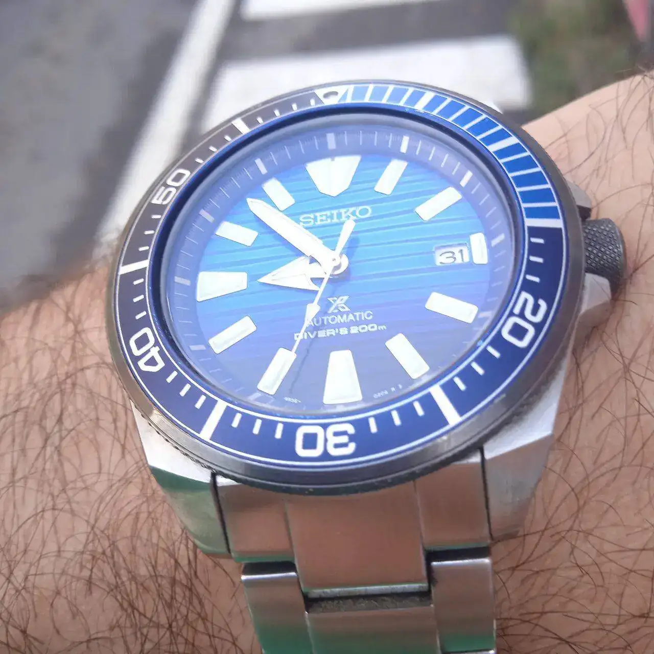 El reloj de la manga corta, y en Sevilla podemos estar hablando de medio año (abril/octubre), es este Seiko Samurái que me regaló mi mujer hace dos años, siendo mi última incorporación. Poco que comentar acerca de un reloj ampliamente conocido, por mi parte está en el rango alto del tamaño de reloj que puedo "tolerar", creo que son 42,5mm. Tiende a ser un poco pesadote pero rezuma calidad por todas partes desde que te lo pones por primera vez.