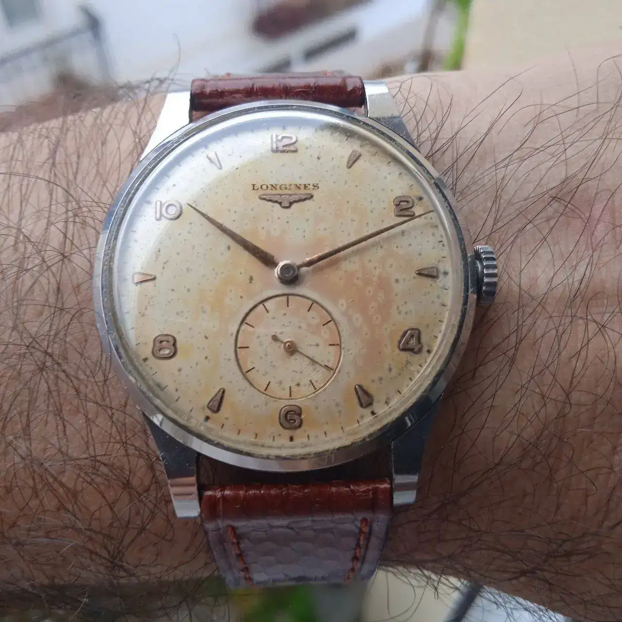 El segundo de los relojes heredados es este Longines que fue propiedad de un tío mío. Monta un calibre 1268z de Longines y con sus 36mm está justo en el límite (por abajo) en cuanto a tamaño, así que me lo pongo bastante más que el Omega. Me gusta mucho este reloj.