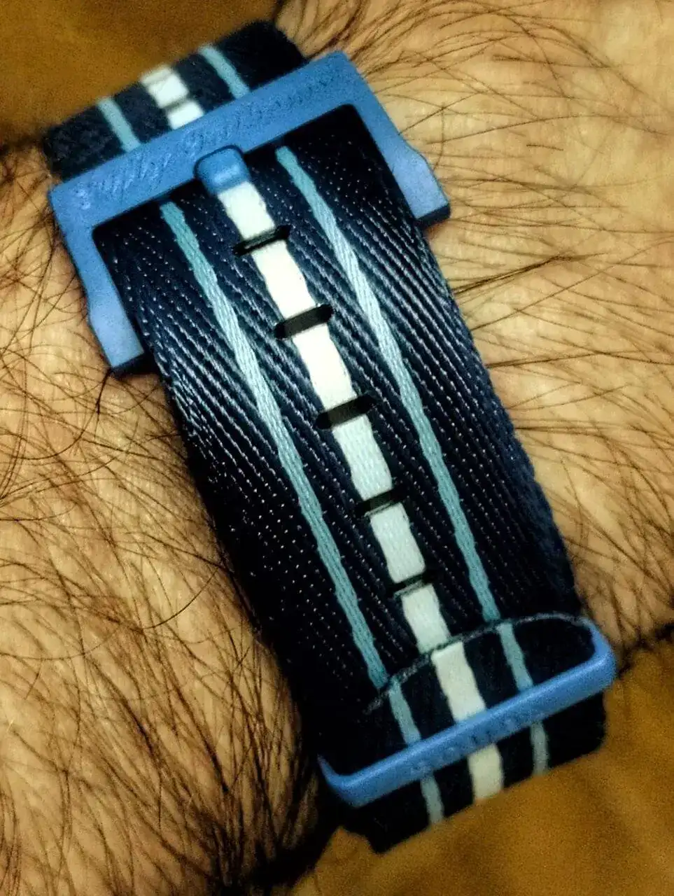Su NATO de plástico me gusta, y parece perfectamente conjuntada. Tiene tiene las hebillas de plástico, pero es algo completamente coherente con el reloj.