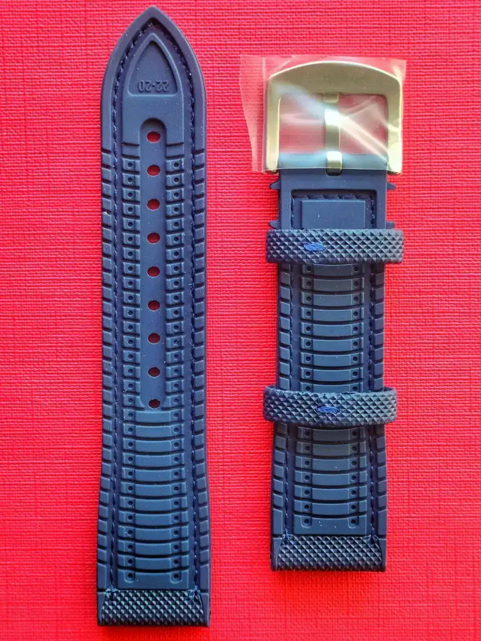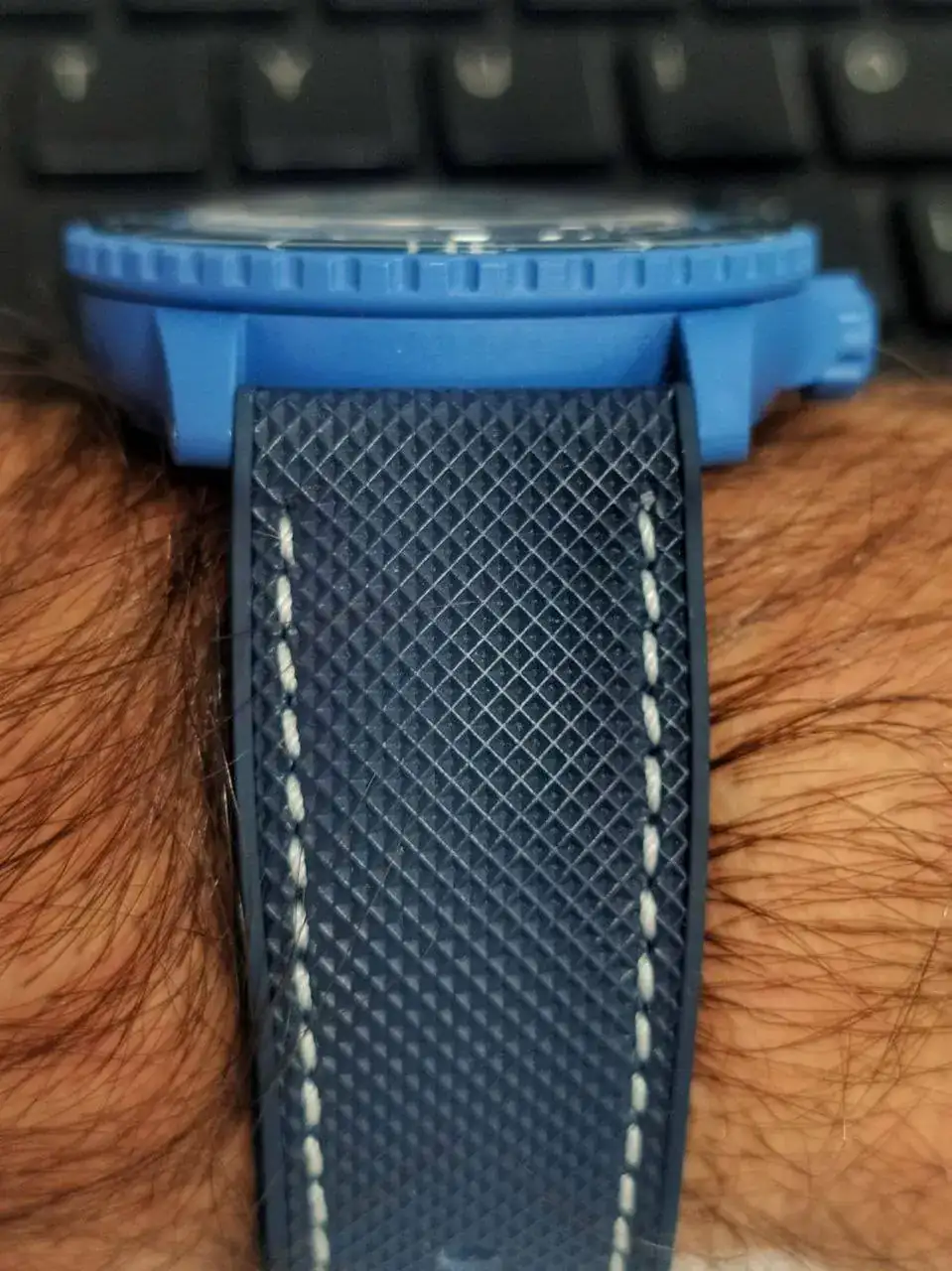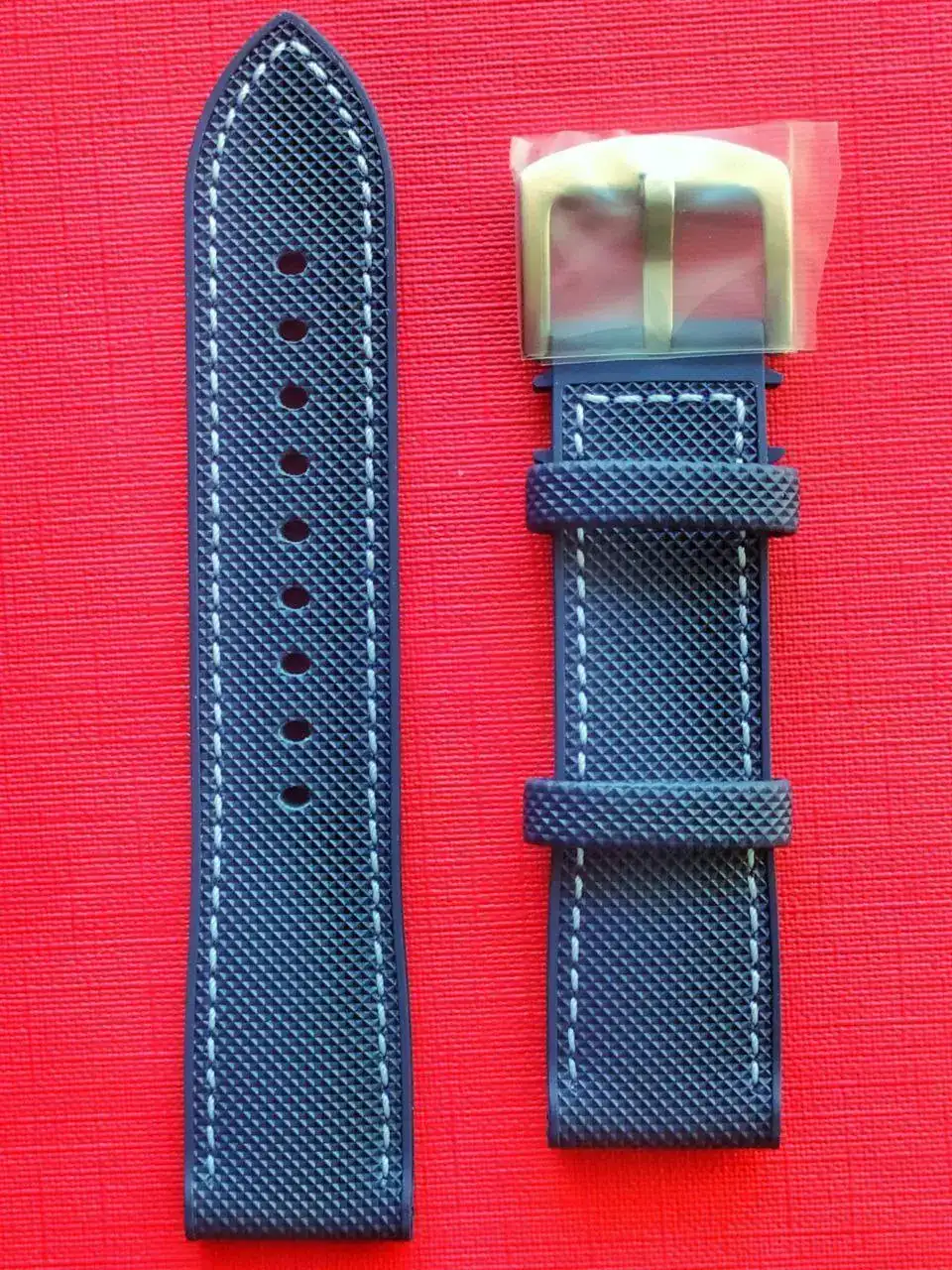 Me puse a buscar correas, y encontré la que creo que es perfecta para él: una de caucho (o material similar) con acabado sailcloth (correa que suele equipar al Fifty fathoms original), de color azul.