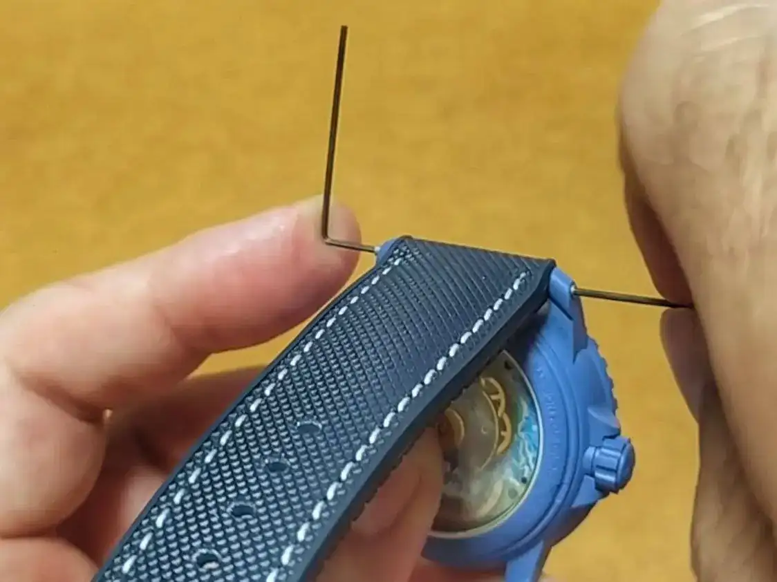 La correa viene con dos mini llaves allen incluídas. Necesarias para el cambio de correa, ya que este reloj no cuenta con pasadores de resorte convencionales (replicando al Fifty Fathoms original). En cambio, tiene asas perforadas y pasadores roscados. Sin embargo, para desenroscarlos, no se utiliza un destornillador, sino herramientas diferentes: dos llaves Allen de tamaño pequeño (0.89 mm). Al igual que en el FF.