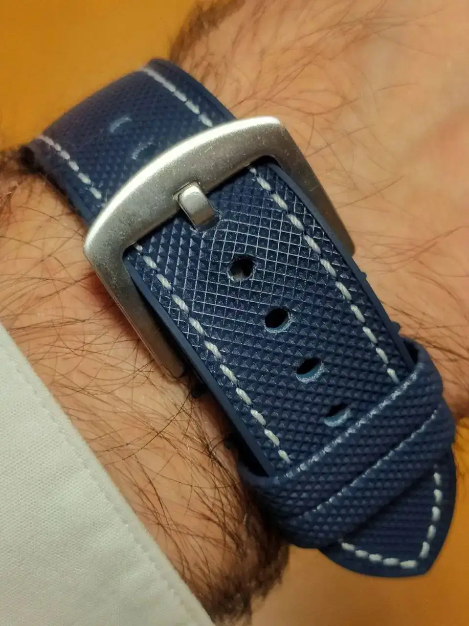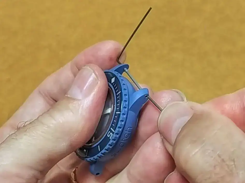 Pero aún es bastante más difícil insertar con precisión el pasador (que ya está dentro de la correa) en el agujero de la segunda garra. Es habitual tener que realizar varios intentos (porque la visibilidad es muy difícil), y con un reloj de plástico (biocerámico🙄), los intentos frecuentes pueden causar daños.