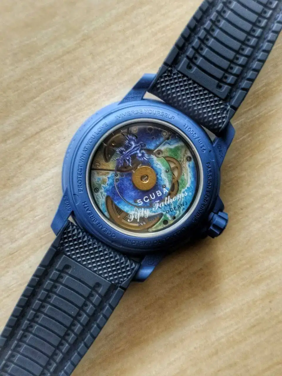 No obstante, creo que vale la pena cambiar la correa (aunque la NATO original sea atractiva) por esta de goma con un acabado sailcloth. Además, ahora es más fácil ver la parte trasera decorada de este Atlántico, que está oculta cuando se usa la correa NATO.