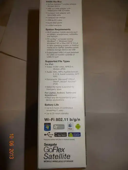 El dispositivo de almacenamiento inalámbrico móvil GoFlex Satellite forma parte del sistema de almacenamiento GoFlex® de Seagate®. Este innovador sistema hace que sea increíblemente fácil actualizar o cambiar la interfaz del sistema GoFlex Satellite, por lo que siempre podrá disfrutar de la velocidad de transferencia óptima al cargar o sincronizar el contenido multimedia.