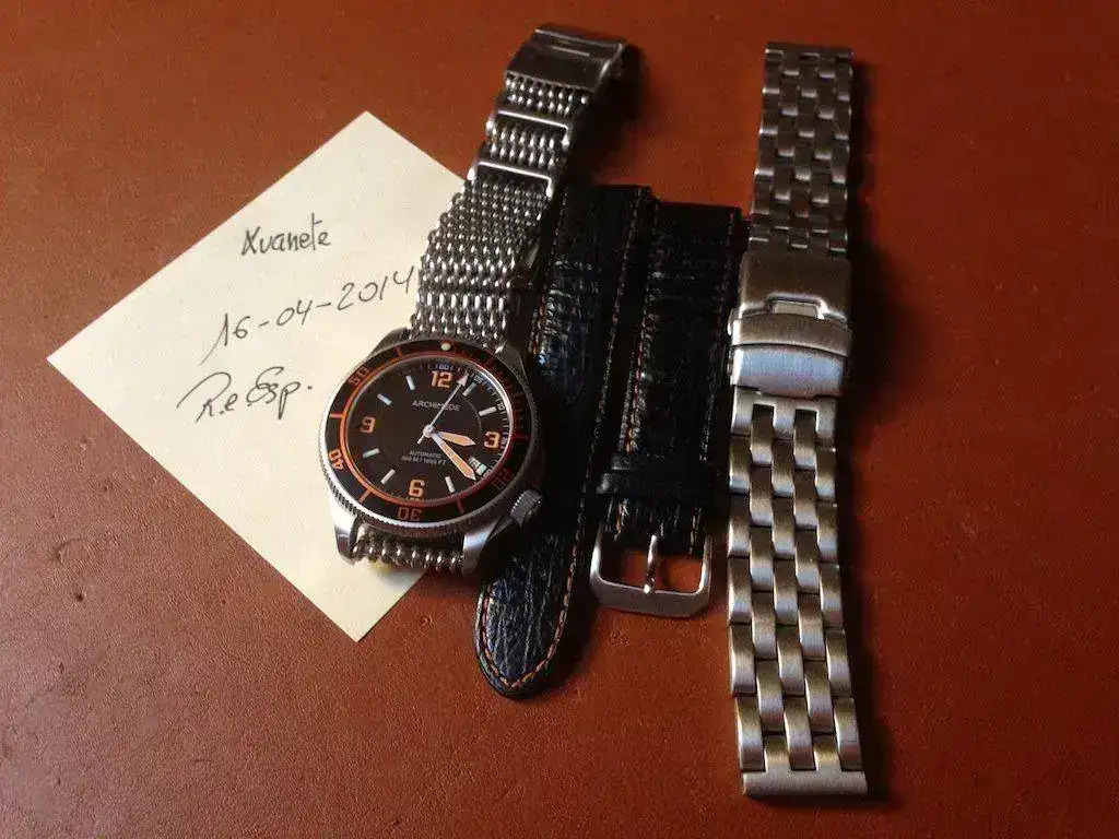 Características principales: caja de acero inoxidable de 42mm, ETA 2824, cristal de zafiro, fondo visto, sumergible a 300 mts, bisel unidireccional. Se entrega con el completo lote que aparece en las fotos: correa original de piel de tiburón discretamente usada, armis mazizo con end links rectos y milanesa con extensiones H.