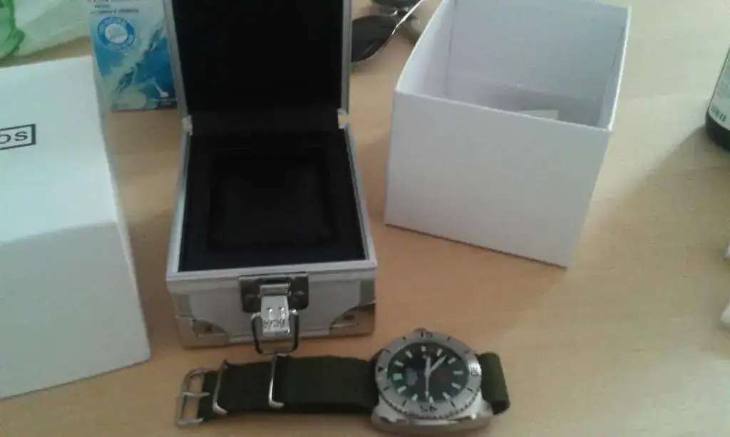Se te enviaría con tooodo el pack visto en las fotos: Caja exterior de cartón,caja interior de aluminio,garantía,etc.....y te regalo también,aparte de la nato, una Canvas verde que le queda de p.m.