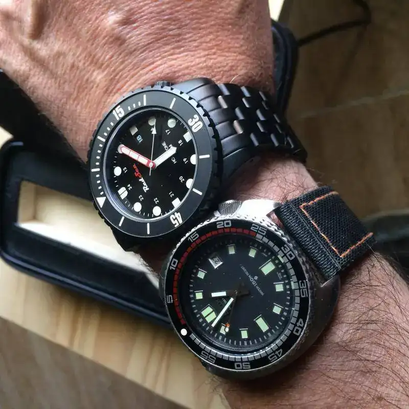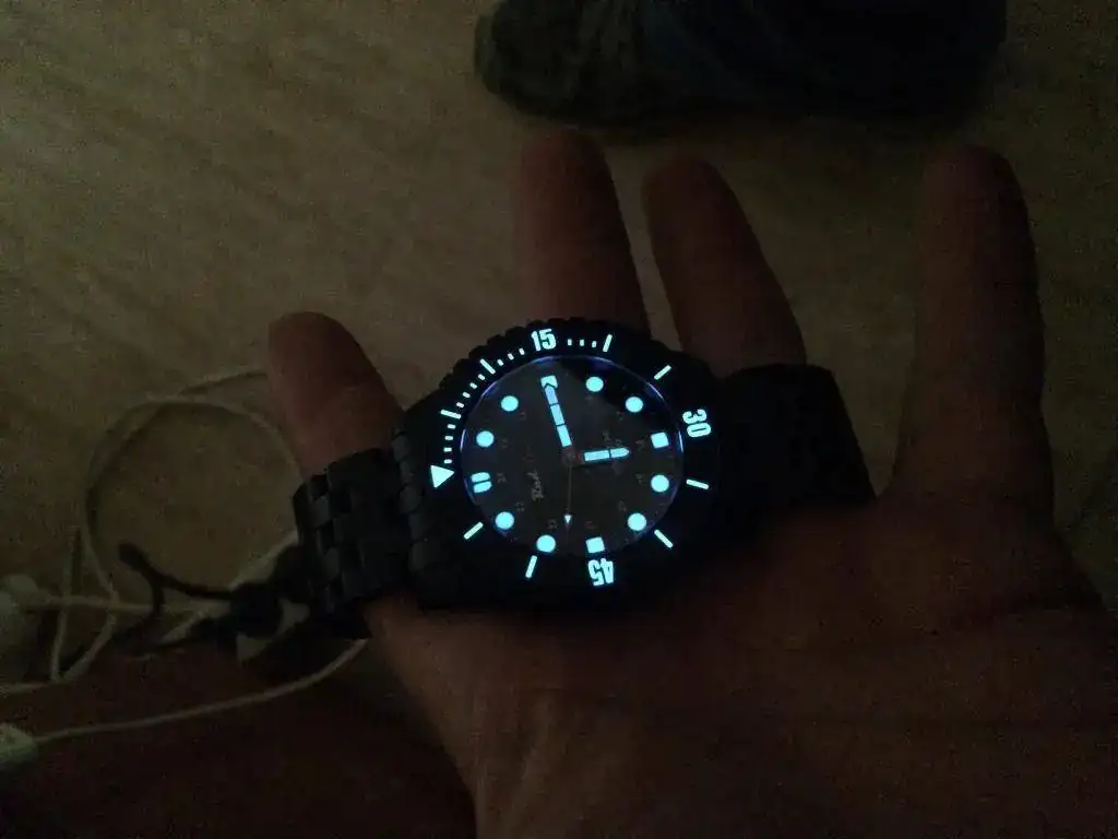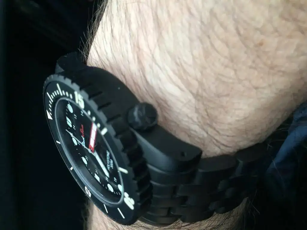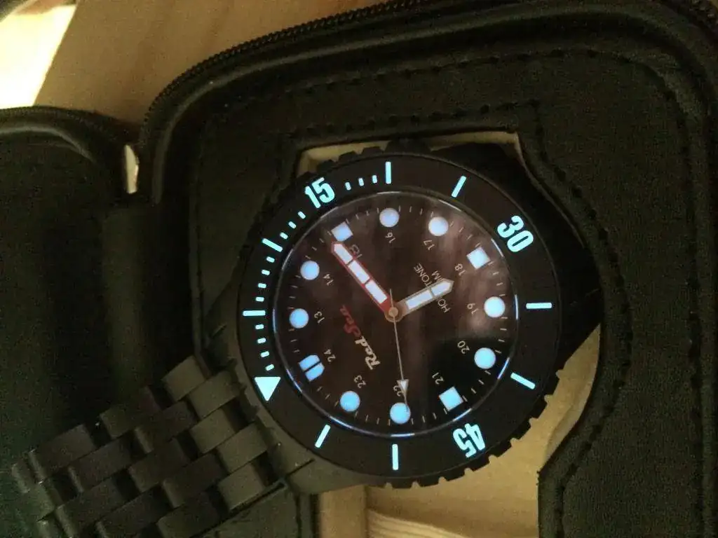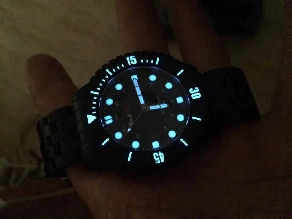 Caja de acero en PVD mate de 44 mm. Cristal de zafiro, corona y fondo a rosca. Luminova azul de Lum Tec. Estanco a 300 metros.