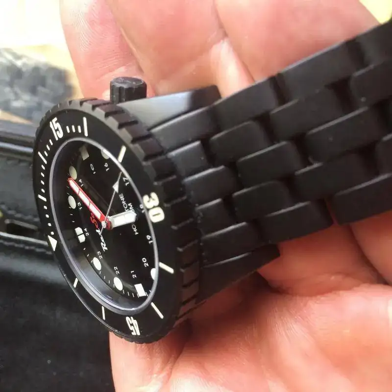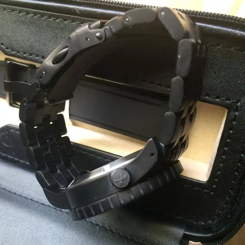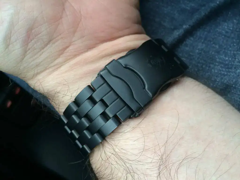Armis macizo en PVD ajustado a muñecas de 18 cms aprox. Se entregan los eslabones sobrantes y un caucho que venía como parte de la dotación.