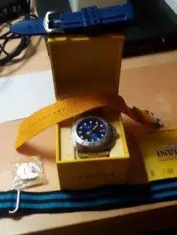 [TD]Pues te lo mando con el armis original de Invicta,con eslabones sólidos y usable hasta los 24 centímetros de muñeca.Lleva doble cierre de seguridad.Y de regalo: un caucho azul a juego con la esfera,una nato azul,una nato azul y negra y una nato amarilla,para usarlas en veranito.[/TD]
