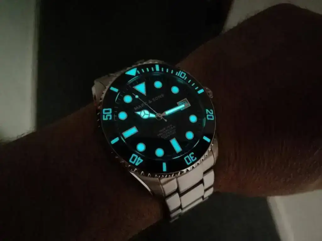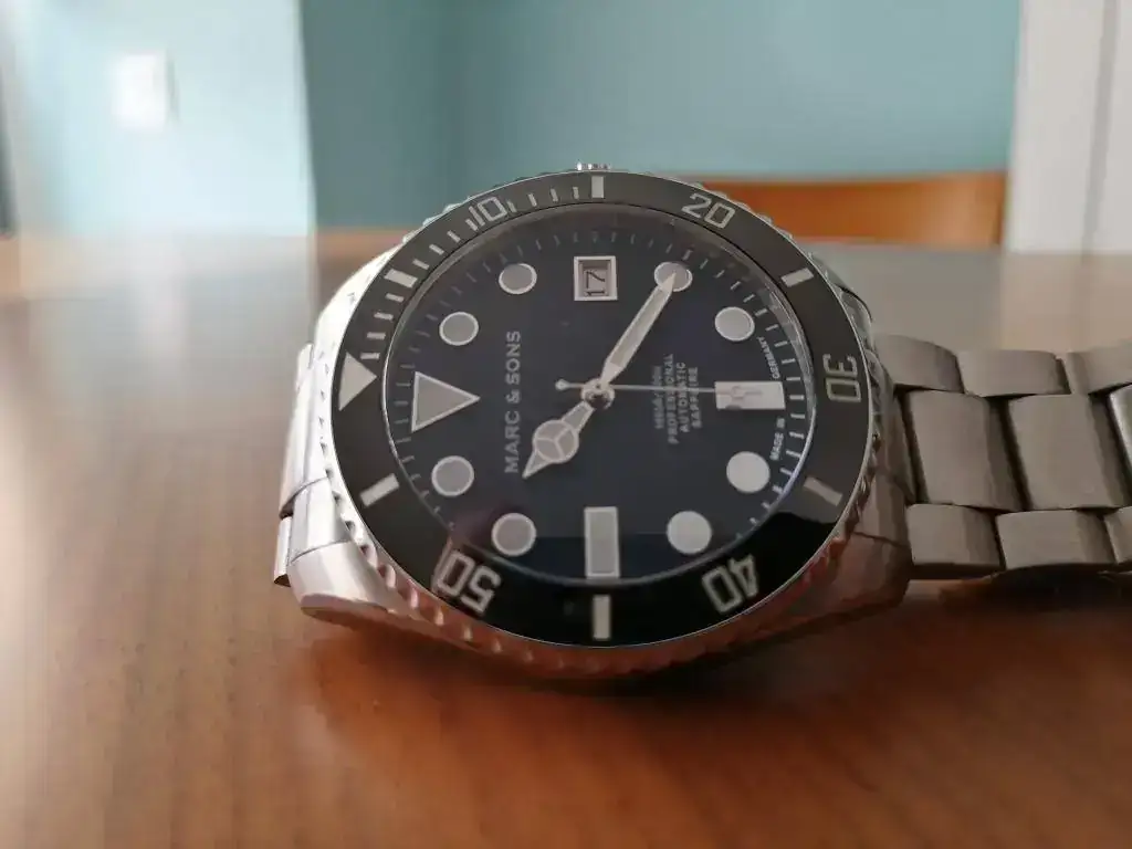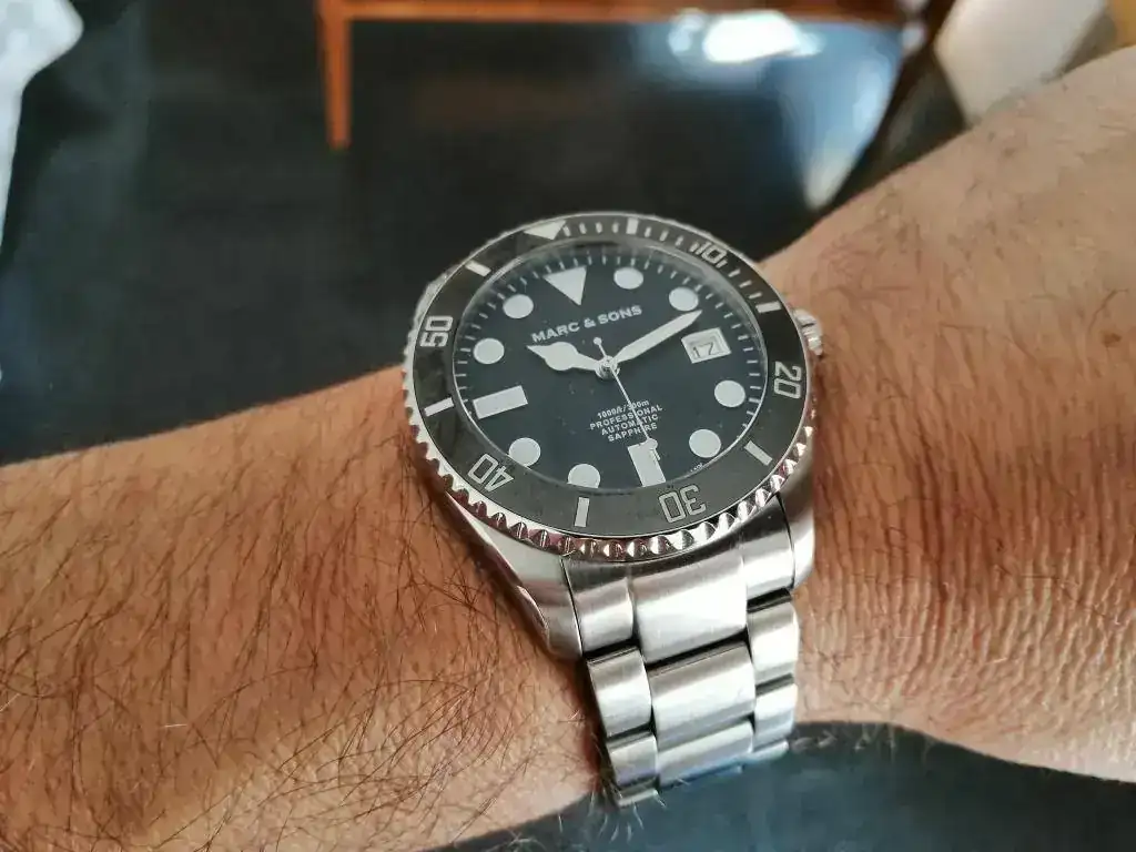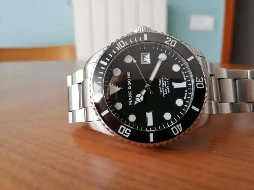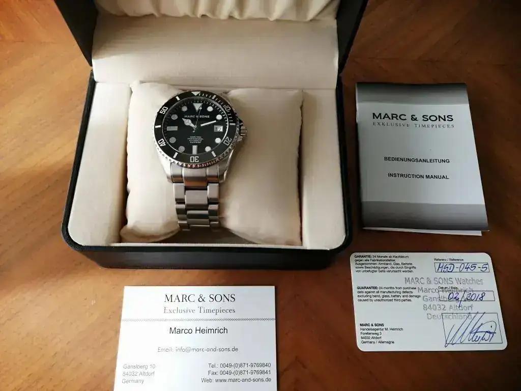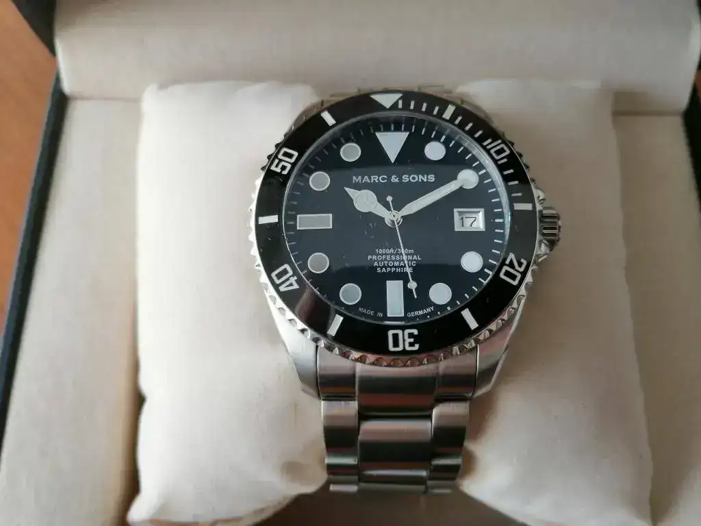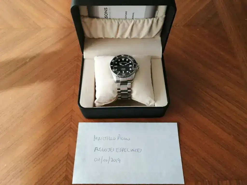 saco a la venta este diver de la marca alemana Marc & Sons en estado perfecto, pues apenas ha tenido uso desde que lo compre a un compañero. A destacar la calidad y robustez que transmite gracias a su bisel de cerámica, cristal de zafiro y armis de acero macizo. Además, es sumergible hasta 300 metros. Se entrega con su dotación completa (caja, manual, tarjeta de garantía y eslabones sobrantes). El reloj fue comprado en febrero de 2018, por lo que le queda más de un año de garantía por delante.