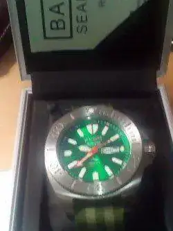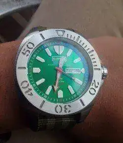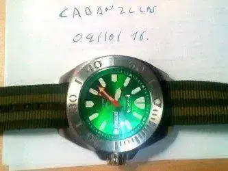 [TD]Un bonito verde hierba,con un excelente lume en los marcadores,a juego con las agujas tipo buz😵jo,lleva grabado GERMAN CABANILLAS en la esfera,de forma poco visible....pero lo lleva.[/TD]