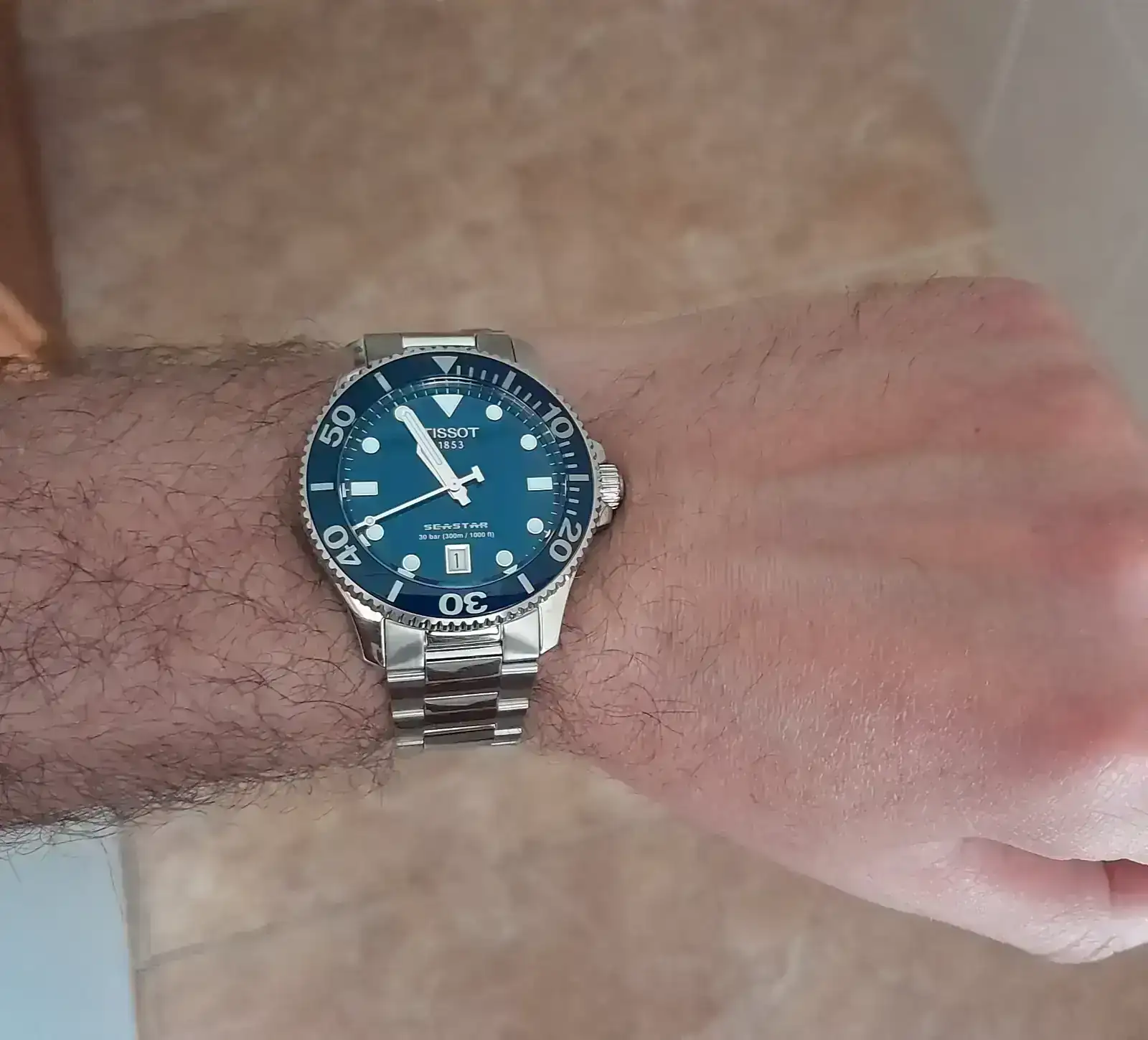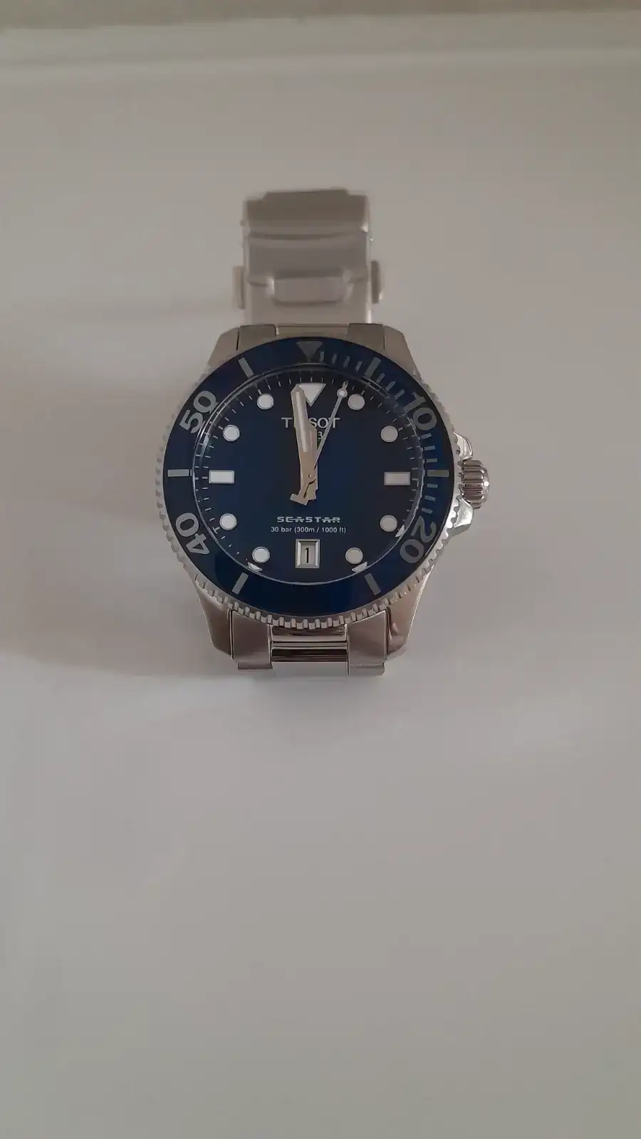 Mirando varias opciones topé con el Tissot Seastar 1000 en cuarzo, los de 40 estaban agotados, pero vi los de 36mm y como tengo varios relojes de 35-36mm y una muñeca de princesa de 15,5 cm decidí probarmelo y ver que tal aunque no muy convencido.