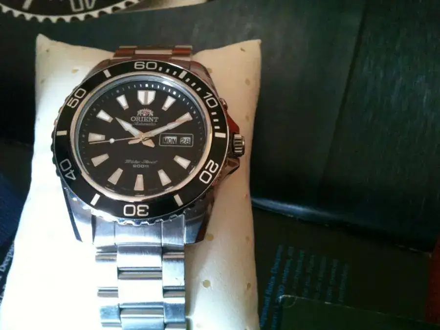 El calibre de este Orient es el conocido 46943, automático. Funciona a 21.600 alternancias por hora, con una reserva de marcha de unas 40 horas. Tiene indicador de fecha y día de la semana a las tres. El pulsador de las 2 se utiliza para ajustar el día de la semana, a elegir entre inglés e ingles con número de día de semana.