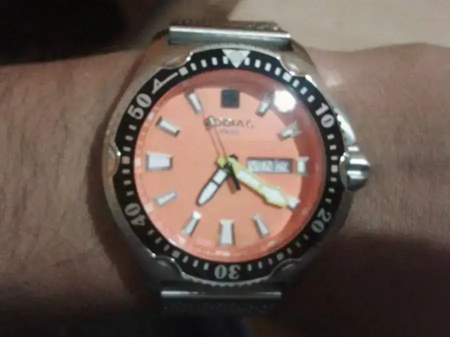 Bisel giratorio unidireccional con 120 clicks. Esfera en un bonito color naranja...muy "Doxa style"